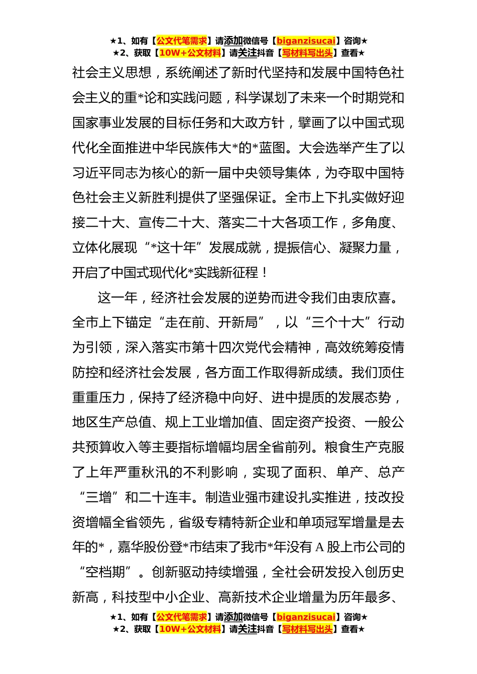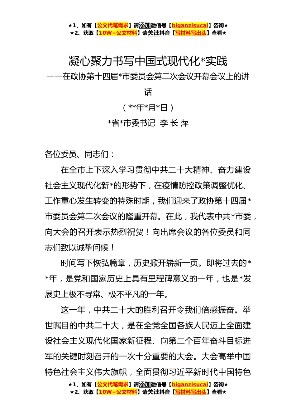 ★1、如有【公文代笔需求】请添加微信号【biganzisucai】咨询★★2、获取【10W+公文材料】请关注抖音【写材料写出头】查看★凝心聚力书写中国式现代化*实践——在政协第十四届*市委员会第二次会议开幕会议上的讲话(**年*月*日)*省*市委书记李长萍各位委员、同志们:在全市上下深入学习贯彻中共二十大精神、奋力建设社会主义现代化新*的形势下,在疫情防控政策调整优化、工作重心发生转变的特殊时期,我们迎来了政协第十四届*市委员会第二次会议的隆重开幕。在此,我代表中共*市委,向大会的召开表示热烈祝贺!向出席会议的各位委员和同志们致以诚挚问候!时间写下恢弘篇章,历史掀开崭新一页。即将过去的**年,是党和国家历史上具有里程碑意义的一年,也是*发展史上极不寻常、极不平凡的一年。这一年,中共二十...