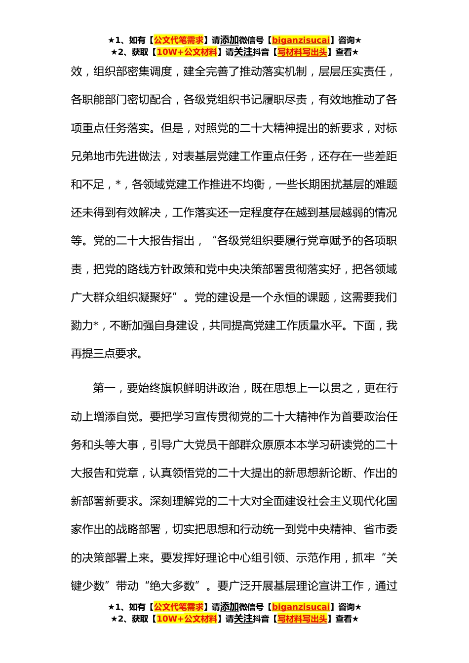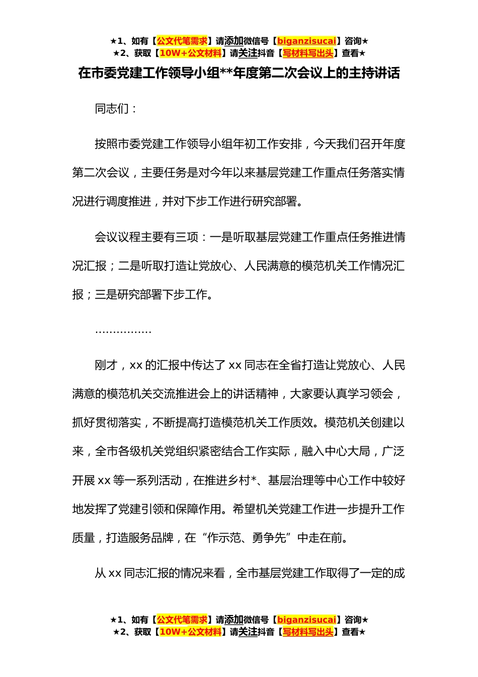 ★1、如有【公文代笔需求】请添加微信号【biganzisucai】咨询★★2、获取【10W+公文材料】请关注抖音【写材料写出头】查看★在市委党建工作领导小组**年度第二次会议上的主持讲话同志们:按照市委党建工作领导小组年初工作安排,今天我们召开年度第二次会议,主要任务是对今年以来基层党建工作重点任务落实情况进行调度推进,并对下步工作进行研究部署。会议议程主要有三项:一是听取基层党建工作重点任务推进情况汇报;二是听取打造让党放心、人民满意的模范机关工作情况汇报;三是研究部署下步工作。................刚才,xx的汇报中传达了xx同志在全省打造让党放心、人民满意的模范机关交流推进会上的讲话精神,大家要认真学习领会,抓好贯彻落实,不断提高打造模范机关工作质效。模范机关创建以来,全市各级...