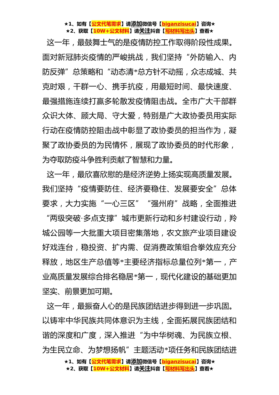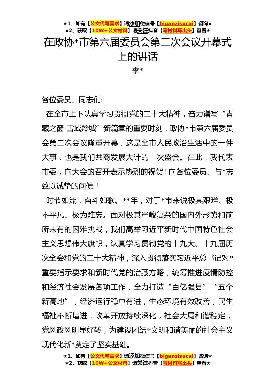 ★1、如有【公文代笔需求】请添加微信号【biganzisucai】咨询★★2、获取【10W+公文材料】请关注抖音【写材料写出头】查看★在政协*市第六届委员会第二次会议开幕式上的讲话李*各位委员、同志们:在全市上下认真学习贯彻党的二十大精神,奋力谱写“青藏之窗·雪域羚城”新篇章的重要时刻,政协*市第六届委员会第二次会议隆重开幕,这是全市人民政治生活中的一件大事,也是我们共商发展大计的一次盛会。在此,我代表市委,向大会的召开表示热烈的祝贺!向各位委员、与*志致以诚挚的问候!时节如流,奋斗如歌。**年,对于*市来说极其艰难、极不平凡、极为难忘。面对极其严峻复杂的国内外形势和前所未有的困难挑战,我们高举习近平新时代中国特色社会主义思想伟大旗帜,认真学习贯彻党的十九大、十九届历次全会和党的二...