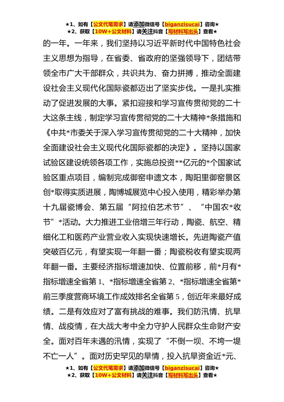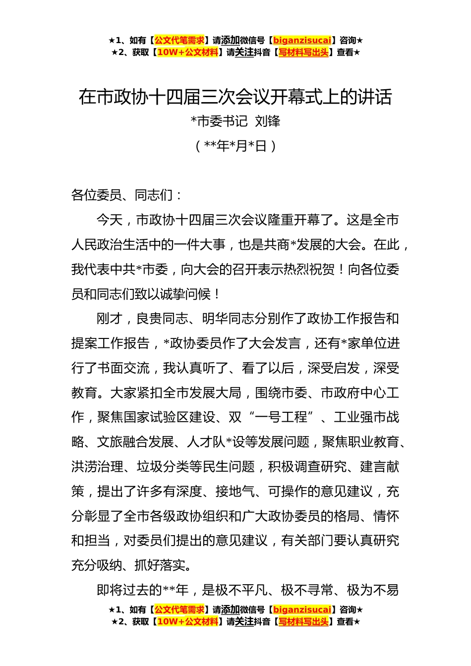 ★1、如有【公文代笔需求】请添加微信号【biganzisucai】咨询★★2、获取【10W+公文材料】请关注抖音【写材料写出头】查看★在市政协十四届三次会议开幕式上的讲话*市委书记刘锋(**年*月*日)各位委员、同志们:今天,市政协十四届三次会议隆重开幕了。这是全市人民政治生活中的一件大事,也是共商*发展的大会。在此,我代表中共*市委,向大会的召开表示热烈祝贺!向各位委员和同志们致以诚挚问候!刚才,良贵同志、明华同志分别作了政协工作报告和提案工作报告,*政协委员作了大会发言,还有*家单位进行了书面交流,我认真听了、看了以后,深受启发,深受教育。大家紧扣全市发展大局,围绕市委、市政府中心工作,聚焦国家试验区建设、双“一号工程”、工业强市战略、文旅融合发展、人才队*设等发展问题,聚焦职...