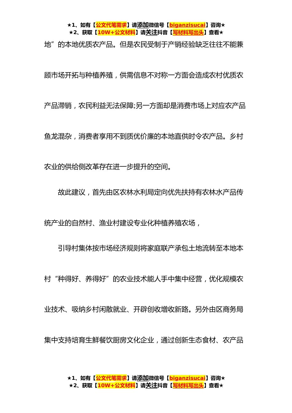 ★1、如有【公文代笔需求】请添加微信号【biganzisucai】咨询★★2、获取【10W+公文材料】请关注抖音【写材料写出头】查看★人大政协提案:关于定向扶持乡村农业、培育产供精准对接的议案乡村*战略自十九大首次提出后,相继成为XXX年中央经济工作会议和中央农村工作会议上的重点议题之一。实施乡村*战略,不但是解决人民日益增长的美好生活需要和不平衡不充分的发展之间矛盾的必然要求,更是实现“两个一百年”奋斗目标,进而实现全体人民共同*的必然要求。XX西片各乡镇山*田*丰富,多有种植养殖产业。行政区划调整完成后,*片的广袤乡村和山区更是迎来了“*后花园、市民菜园子”的发展新契机。在现代供应链条件下,通过农产品返城,为*居民带来了如横街大雷黄泥拱笋、章水樟村浙贝等“原汁原味原产★1、如有【公文...