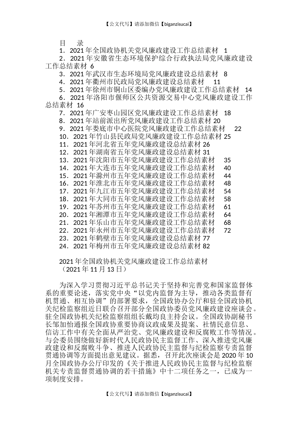 【公文代写】请添加微信【biganzisucai】目录1.2021年全国政协机关党风廉政建设工作总结素材12.2021年安徽省生态环境保护综合行政执法局党风廉政建设工作总结素材63.2021年武汉市生态环境局党风廉政建设总结素材84.2021年衢州市民政局党风廉政建设总结素材115.2021年徐州市铜山区委编办党风廉政建设工作总结素材146.2021年洛阳市偃师区公共资源交易中心党风廉政建设工作总结素材167.2021年广安枣山园区党风廉政建设工作总结素材188.2021年站前派出所党风廉政建设工作总结素材209.2021年娄底市中心医院党风廉政建设工作总结素材2210.2021年竹山县民政局党风廉政建设工作总结素材2511.2021年河北省五年党风廉政建设总结素材2612.2021年湖南省五年党风廉政建设总结素材3113.2021年沈阳市五年党风廉政建...