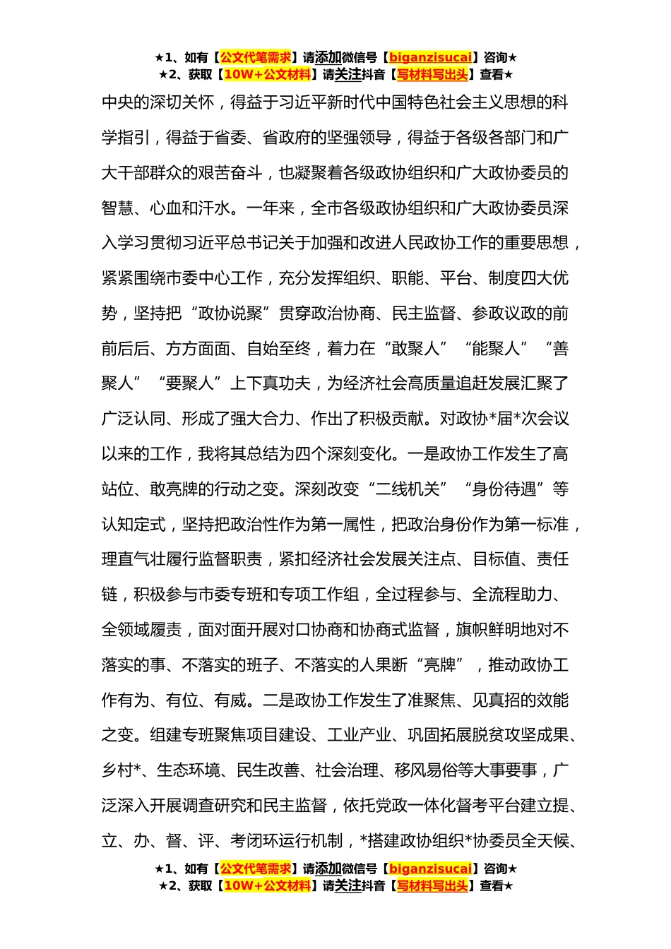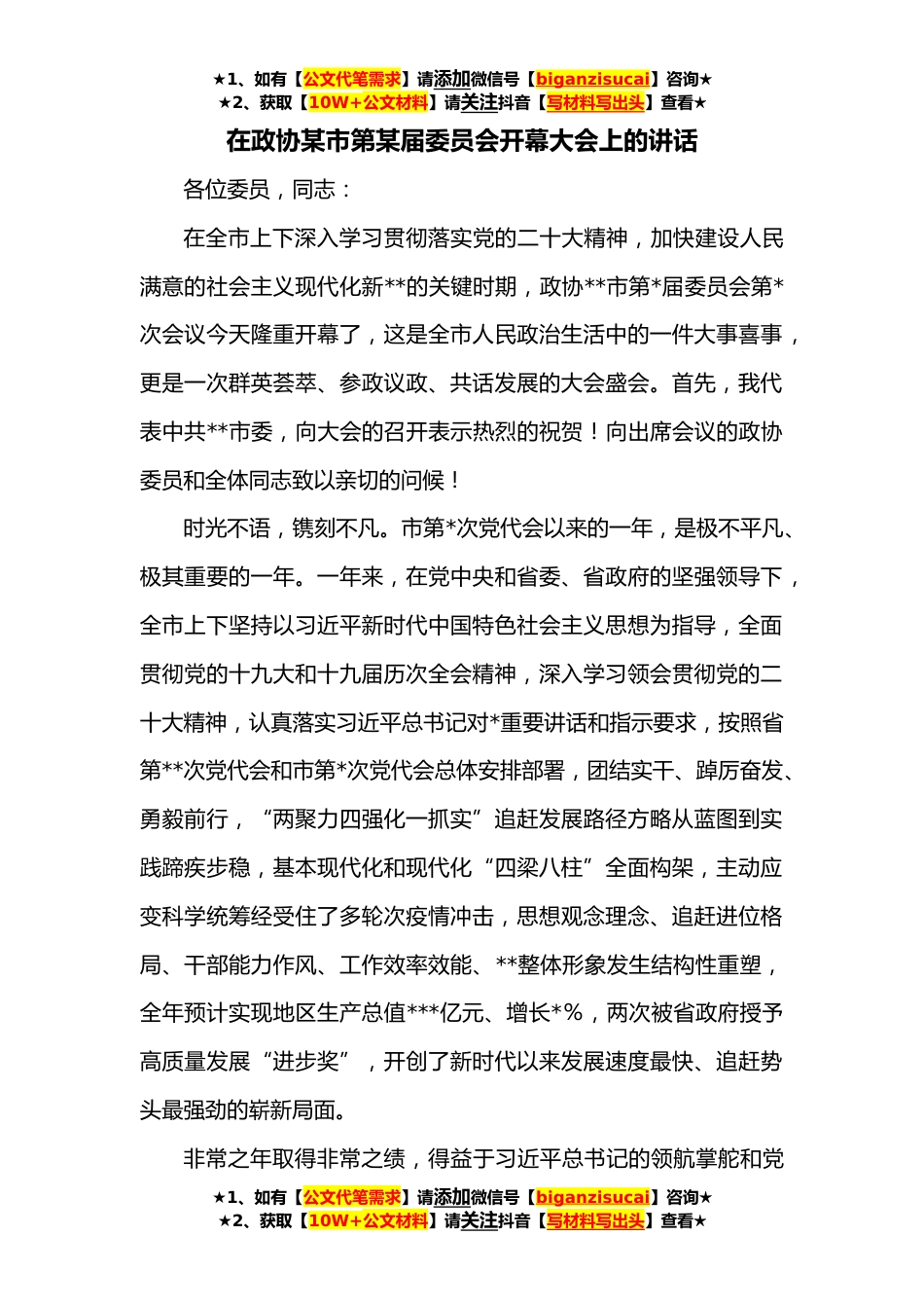★1、如有【公文代笔需求】请添加微信号【biganzisucai】咨询★★2、获取【10W+公文材料】请关注抖音【写材料写出头】查看★在政协某市第某届委员会开幕大会上的讲话各位委员,同志:在全市上下深入学习贯彻落实党的二十大精神,加快建设人民满意的社会主义现代化新**的关键时期,政协**市第*届委员会第*次会议今天隆重开幕了,这是全市人民政治生活中的一件大事喜事,更是一次群英荟萃、参政议政、共话发展的大会盛会。首先,我代表中共**市委,向大会的召开表示热烈的祝贺!向出席会议的政协委员和全体同志致以亲切的问候!时光不语,镌刻不凡。市第*次党代会以来的一年,是极不平凡、极其重要的一年。一年来,在党中央和省委、省政府的坚强领导下,全市上下坚持以习近平新时代中国特色社会主义思想为指导,全面...