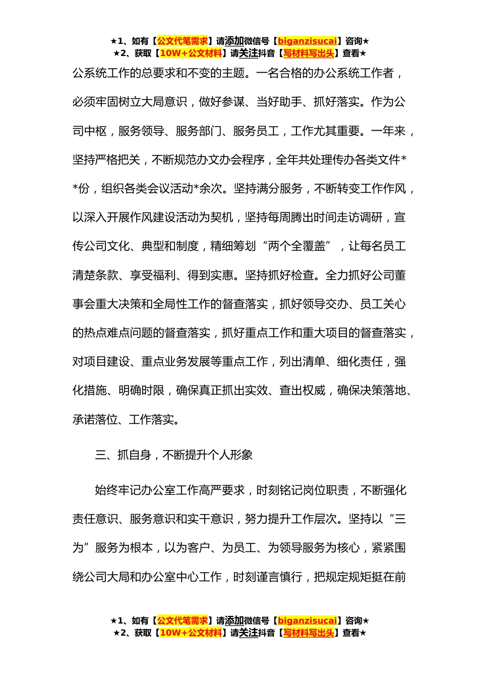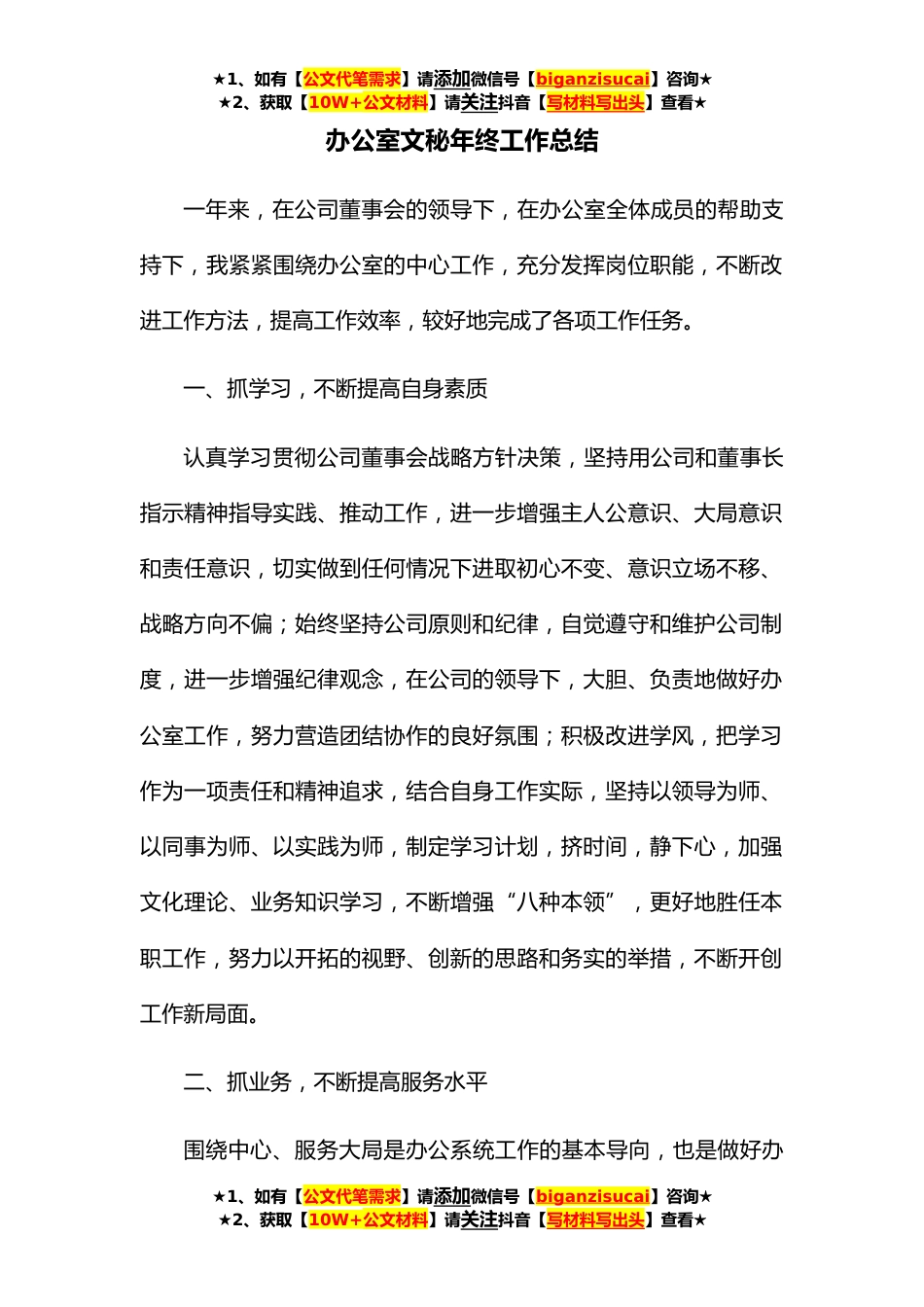 ★1、如有【公文代笔需求】请添加微信号【biganzisucai】咨询★★2、获取【10W+公文材料】请关注抖音【写材料写出头】查看★办公室文秘年终工作总结一年来,在公司董事会的领导下,在办公室全体成员的帮助支持下,我紧紧围绕办公室的中心工作,充分发挥岗位职能,不断改进工作方法,提高工作效率,较好地完成了各项工作任务。一、抓学习,不断提高自身素质认真学习贯彻公司董事会战略方针决策,坚持用公司和董事长指示精神指导实践、推动工作,进一步增强主人公意识、大局意识和责任意识,切实做到任何情况下进取初心不变、意识立场不移、战略方向不偏;始终坚持公司原则和纪律,自觉遵守和维护公司制度,进一步增强纪律观念,在公司的领导下,大胆、负责地做好办公室工作,努力营造团结协作的良好氛围;积极改进...