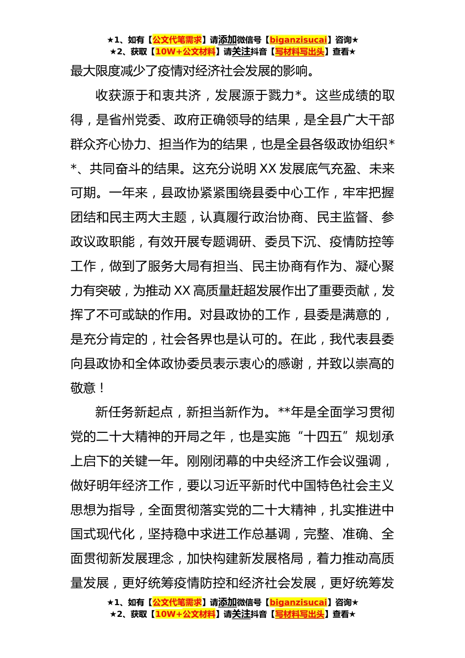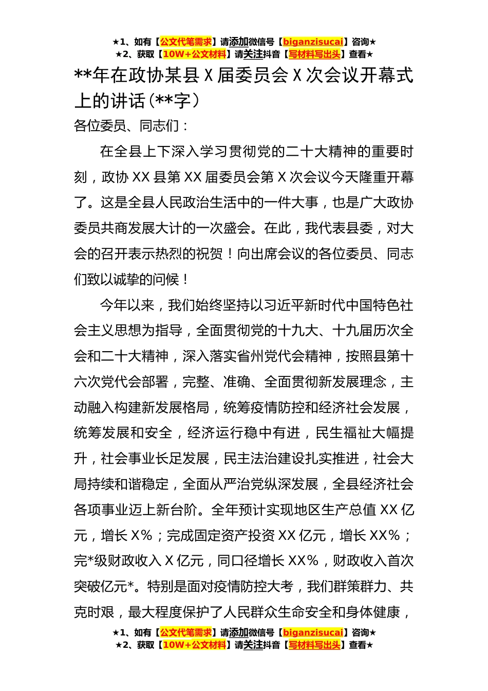 ★1、如有【公文代笔需求】请添加微信号【biganzisucai】咨询★★2、获取【10W+公文材料】请关注抖音【写材料写出头】查看★**年在政协某县X届委员会X次会议开幕式上的讲话(**字)各位委员、同志们:在全县上下深入学习贯彻党的二十大精神的重要时刻,政协XX县第XX届委员会第X次会议今天隆重开幕了。这是全县人民政治生活中的一件大事,也是广大政协委员共商发展大计的一次盛会。在此,我代表县委,对大会的召开表示热烈的祝贺!向出席会议的各位委员、同志们致以诚挚的问候!今年以来,我们始终坚持以习近平新时代中国特色社会主义思想为指导,全面贯彻党的十九大、十九届历次全会和二十大精神,深入落实省州党代会精神,按照县第十六次党代会部署,完整、准确、全面贯彻新发展理念,主动融入构建新发展格局,统...