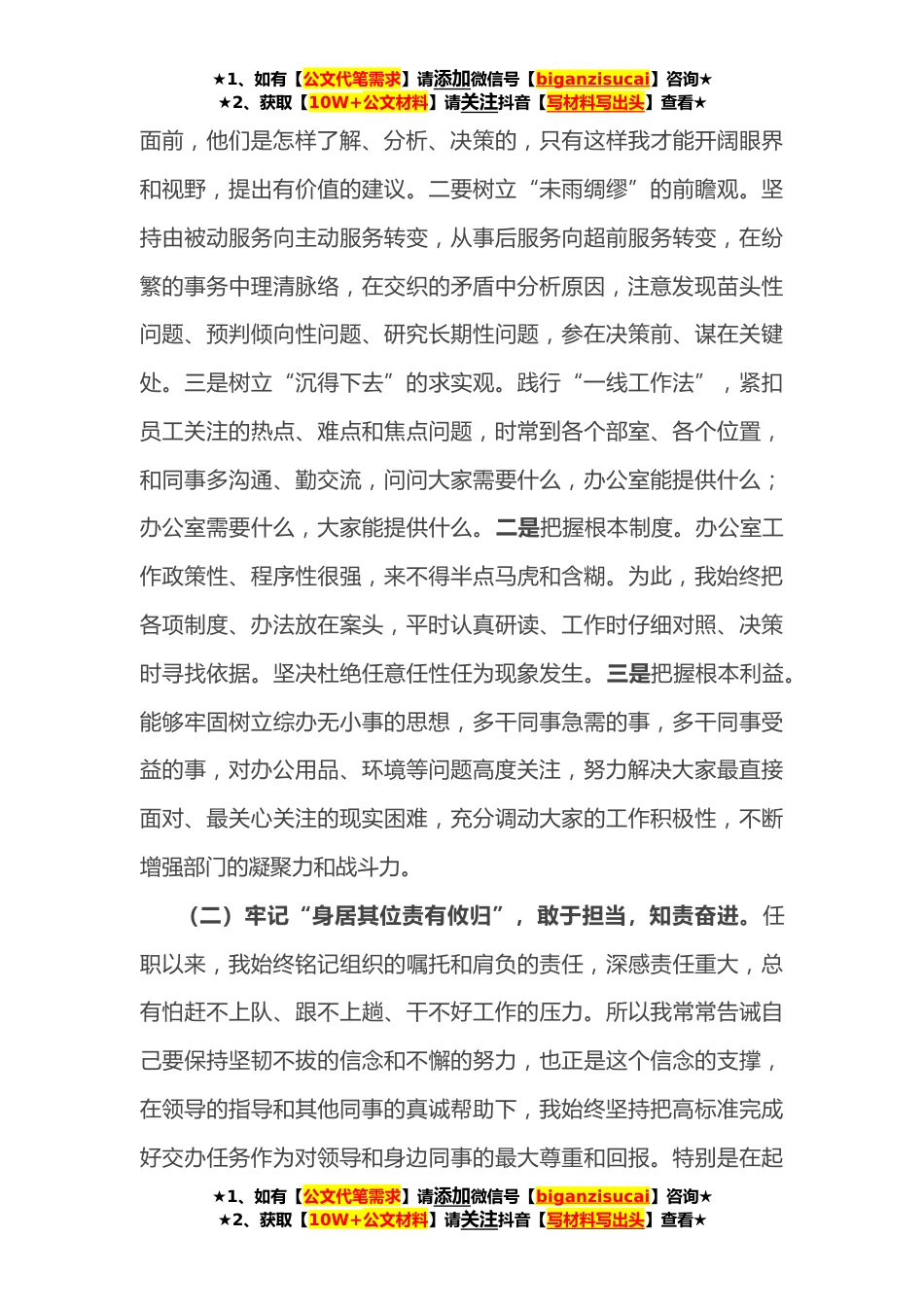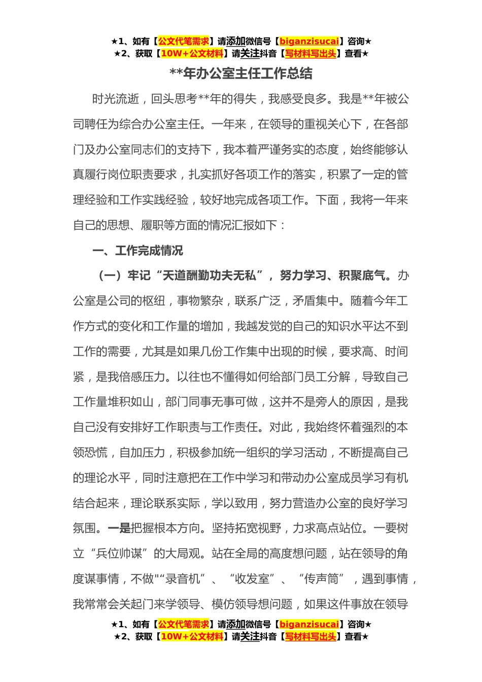 ★1、如有【公文代笔需求】请添加微信号【biganzisucai】咨询★★2、获取【10W+公文材料】请关注抖音【写材料写出头】查看★**年办公室主任工作总结时光流逝,回头思考**年的得失,我感受良多。我是**年被公司聘任为综合办公室主任。一年来,在领导的重视关心下,在各部门及办公室同志们的支持下,我本着严谨务实的态度,始终能够认真履行岗位职责要求,扎实抓好各项工作的落实,积累了一定的管理经验和工作实践经验,较好地完成各项工作。下面,我将一年来自己的思想、履职等方面的情况汇报如下:一、工作完成情况(一)牢记“天道酬勤功夫无私”,努力学习、积聚底气。办公室是公司的枢纽,事物繁杂,联系广泛,矛盾集中。随着今年工作方式的变化和工作量的增加,我越发觉的自己的知识水平达不到工作的需要,尤...