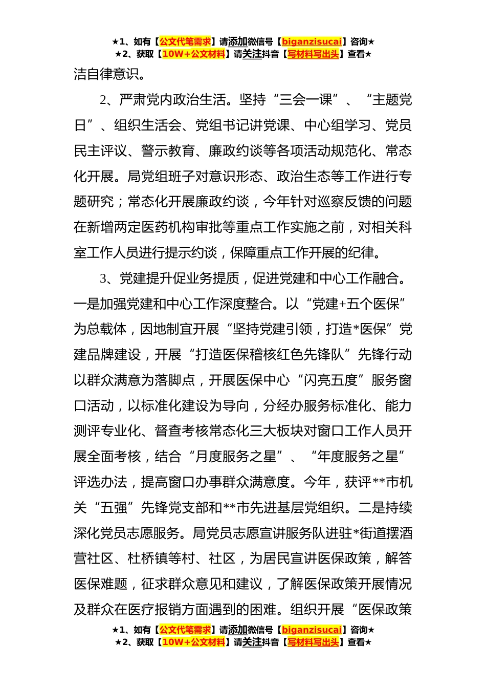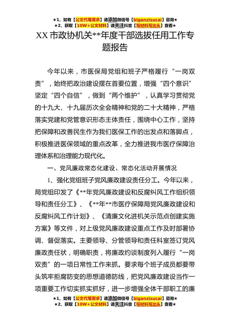 ★1、如有【公文代笔需求】请添加微信号【biganzisucai】咨询★★2、获取【10W+公文材料】请关注抖音【写材料写出头】查看★XX市政协机关**年度干部选拔任用工作专题报告今年以来,市医保局党组和班子严格履行“一岗双责”,始终把政治建设摆在首要位置,增强“四个意识”坚定“四个自信”,做到“两个维护”,认真学习贯彻党的十九大、十九届历次全会精神和党的二十大精神,严格落实党建和党管意识形态主体责任,围绕中心工作,坚持把保障和改善民生作为我们医保工作的出发点和落脚点,积极推进医保领域的重点改革,全力推进我市医疗保障治理体系和治理能力现代化。一、党风廉政常态化建设、常态化活动开展情况1、强化党组班子党风廉政建设责任分工。今年以来,局党组印发了《**年党风廉政建设和反腐纠风工作组织...