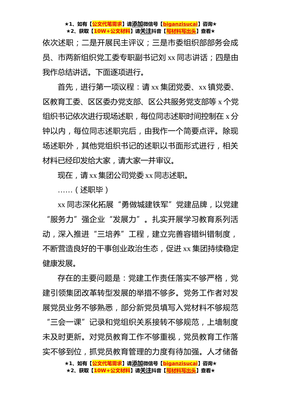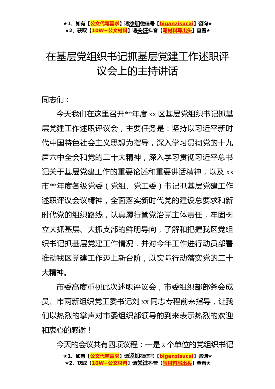 ★1、如有【公文代笔需求】请添加微信号【biganzisucai】咨询★★2、获取【10W+公文材料】请关注抖音【写材料写出头】查看★在基层党组织书记抓基层党建工作述职评议会上的主持讲话同志们:今天我们在这里召开**年度xx区基层党组织书记抓基层党建工作述职评议会,主要任务是:坚持以习近平新时代中国特色社会主义思想为指导,深入学习贯彻党的十九届六中全会和党的二十大精神,深入学习贯彻习近平总书记关于基层党建工作的重要论述和重要讲话精神,以及xx市**年度各级党委(党组、党工委)书记抓基层党建工作述职评议会议精神,全面落实新时代党的建设总要求和新时代党的组织路线,认真履行管党治党主体责任,牢固树立大抓基层、大抓支部的鲜明导向,了解和把握我区党组织书记抓基层党建工作情况,并对今年工作进...