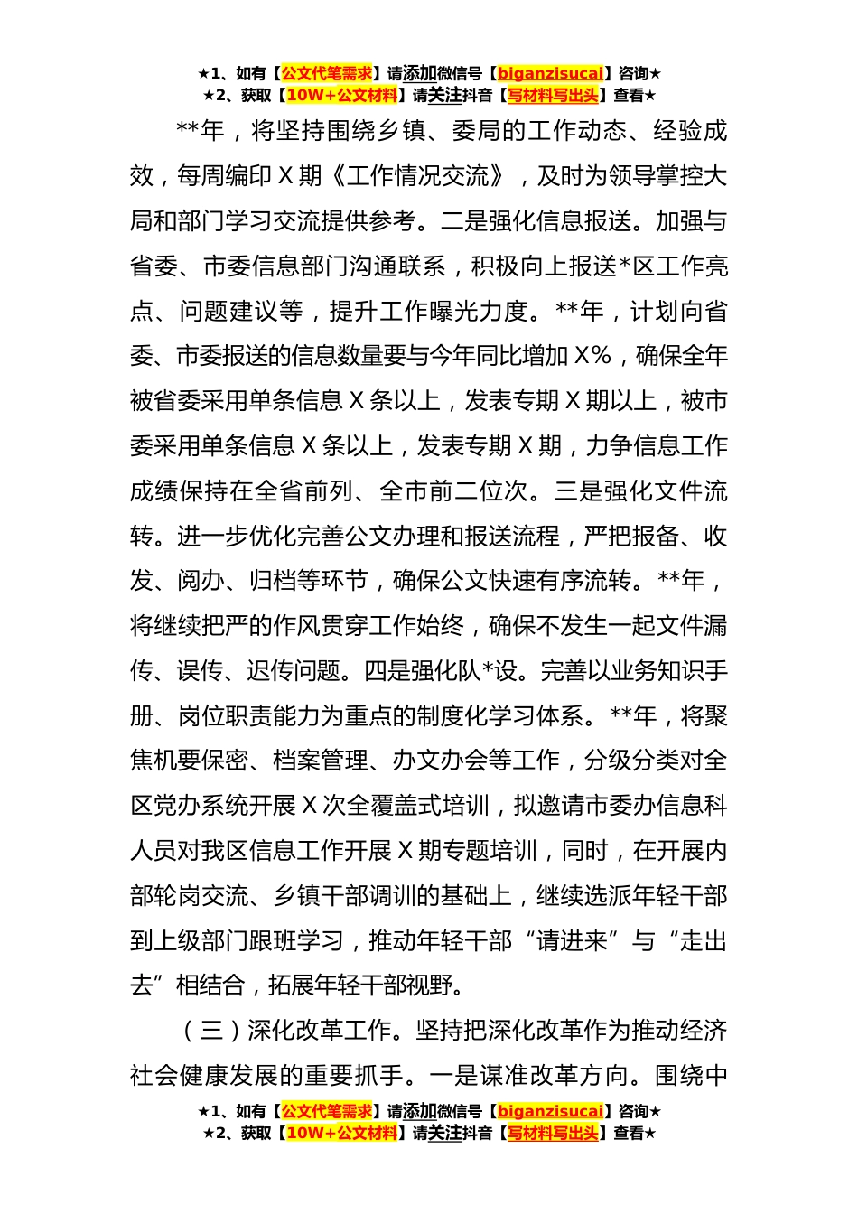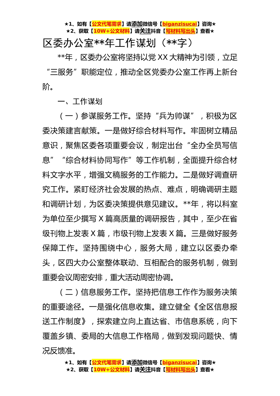 ★1、如有【公文代笔需求】请添加微信号【biganzisucai】咨询★★2、获取【10W+公文材料】请关注抖音【写材料写出头】查看★区委办公室**年工作谋划(**字)**年,区委办公室将坚持以党XX大精神为引领,立足“三服务”职能定位,推动全区党委办公室工作再上新台阶。一、工作谋划(一)参谋服务工作。坚持“兵为帅谋”,积极为区委决策建言献策。一是做好综合材料写作。牢固树立精品意识,聚焦区委各项重要会议,制定出台“全办全员写信息”“综合材料协同写作”等工作机制,全面提升综合材料文字水平,增强文稿服务的工作能力。二是做好调查研究工作。紧盯经济社会发展的热点、难点,明确调研主题和调研计划,为区委决策提供意见建议。**年,将以科室为单位至少撰写X篇高质量的调研报告,其中,至少在省级刊物上发...
