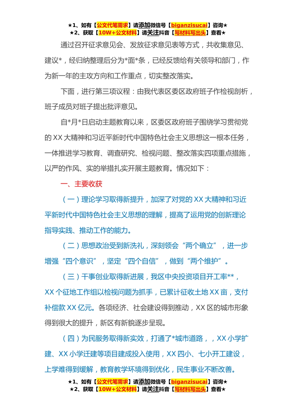 ★1、如有【公文代笔需求】请添加微信号【biganzisucai】咨询★★2、获取【10W+公文材料】请关注抖音【写材料写出头】查看★党委书记在民主生活会上的主持讲话同志们:为深入学习贯彻党的XX大精神和习近平新时代中国特色社会主义思想,盘点收获、检视问题、深刻剖析,推动班子成员履职尽责、团结奋进,根据XX主题教育的工作安排,今天召开XX区区委区政府班子XX主题教育专题民主生活会。市委对开好这次会议高度重视,专门派出工作组给予指导,出席并指导今天会议的领导有:这次专题民主生活会共有七项议程,下面逐项进行:首先,进行第一项议程:通报**度民主生活会整改落实、脱贫攻坚专项巡视和XX省党委巡视整改落实的情况。在**度民主生活会整改落实方面:针对征求到的“强化理论学习”“加强干部教育培训”等*个...