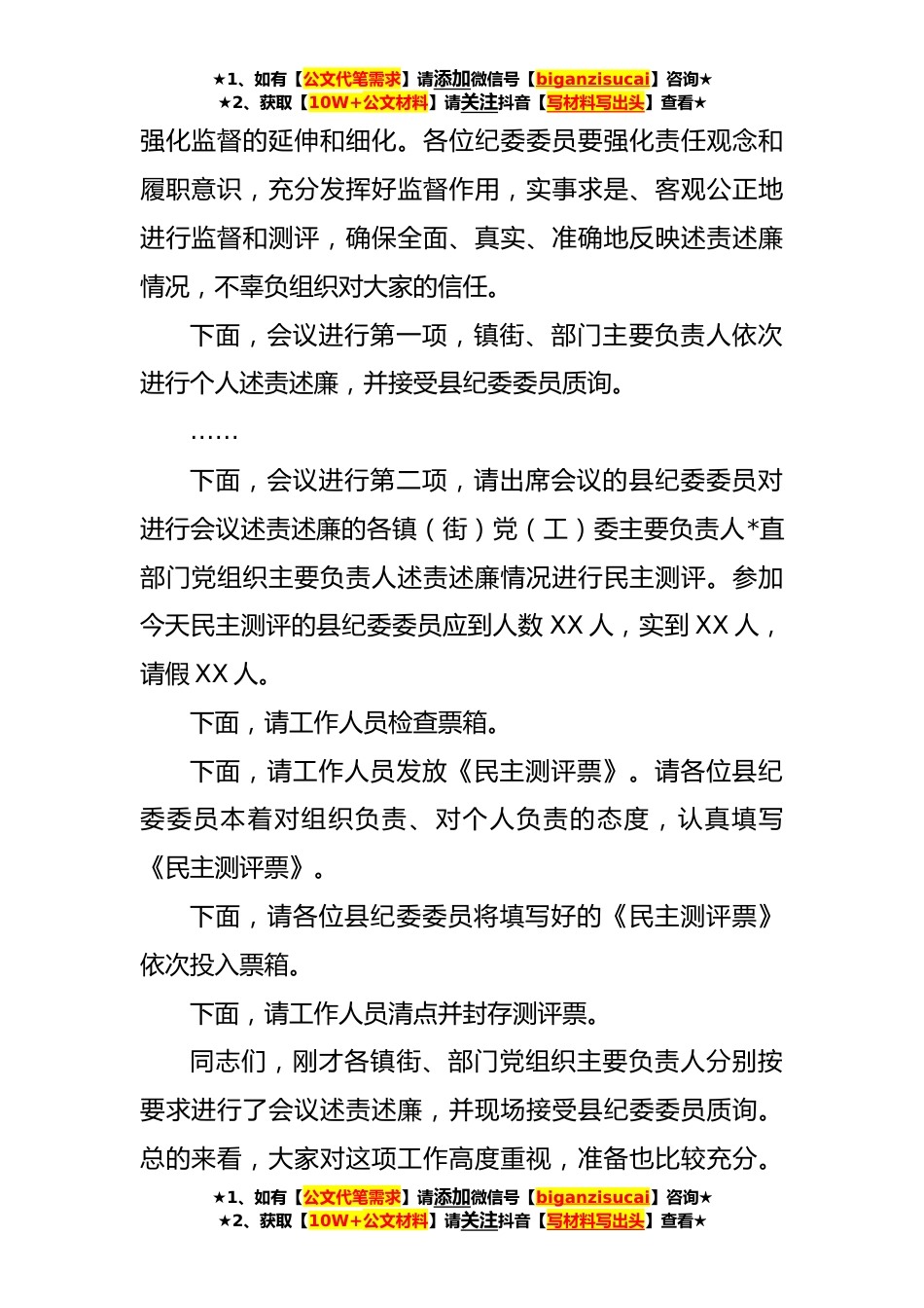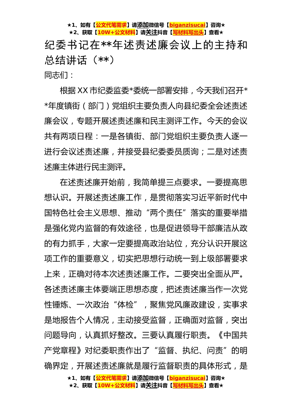 ★1、如有【公文代笔需求】请添加微信号【biganzisucai】咨询★★2、获取【10W+公文材料】请关注抖音【写材料写出头】查看★纪委书记在**年述责述廉会议上的主持和总结讲话(**)同志们:根据XX市纪委监委*委统一部署安排,今天我们召开**年度镇街(部门)党组织主要负责人向县纪委全会述责述廉会议,专题开展述责述廉和民主测评工作。今天的会议共有两项日程:一是各镇街、部门党组织主要负责人逐一进行会议述责述廉,并接受县纪委委员质询;二是对述责述廉主体进行民主测评。在述责述廉开始前,我简单提三点要求。一要提高思想认识。开展述责述廉工作,是贯彻落实习近平新时代中国特色社会主义思想、推动“两个责任”落实的重要举措是强化党内监督的有效途径,也是促进领导干部廉洁从政的有力抓手,大家一定要提...