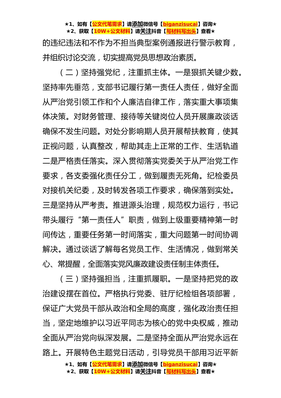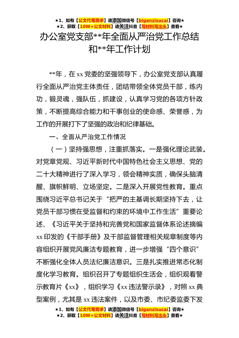 ★1、如有【公文代笔需求】请添加微信号【biganzisucai】咨询★★2、获取【10W+公文材料】请关注抖音【写材料写出头】查看★办公室党支部**年全面从严治党工作总结和**年工作计划**年,在xx党委的坚强领导下,办公室党支部认真履行全面从严治党主体责任,团结带领全体党员干部,练内功,锻灵魂,强队伍,抓建设,认真学习党的各项方针政策,不断提高综合能力和干事创业的使命感、荣誉感,为工作的开展打下了坚强的政治和纪律基础。一、全面从严治党工作情况(一)坚持强思想,注重抓落实。一是强化理论武装。对党章党规、习近平新时代中国特色社会主义思想、党的二十大精神进行了深入学习,领会精神实质,确保头脑清醒、旗帜鲜明、立场坚定。二是深入开展党性教育。重点围绕习近平总书记关于“把严的主基调长期坚...