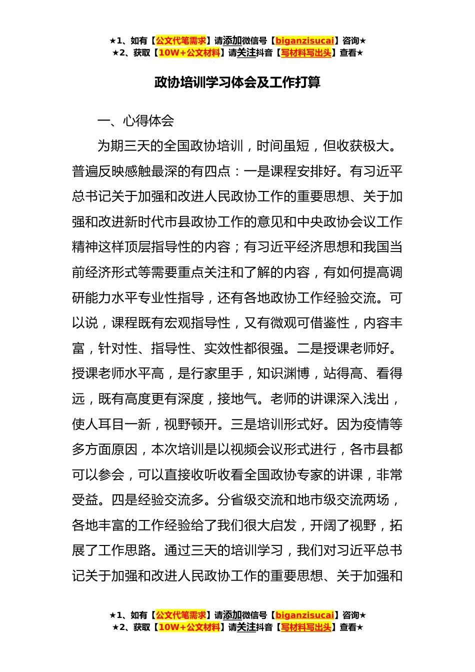 ★1、如有【公文代笔需求】请添加微信号【biganzisucai】咨询★★2、获取【10W+公文材料】请关注抖音【写材料写出头】查看★政协培训学习体会及工作打算一、心得体会为期三天的全国政协培训,时间虽短,但收获极大。普遍反映感触最深的有四点:一是课程安排好。有习近平总书记关于加强和改进人民政协工作的重要思想、关于加强和改进新时代市县政协工作的意见和中央政协会议工作精神这样顶层指导性的内容;有习近平经济思想和我国当前经济形式等需要重点关注和了解的内容,有如何提高调研能力水平专业性指导,还有各地政协工作经验交流。可以说,课程既有宏观指导性,又有微观可借鉴性,内容丰富,针对性、指导性、实效性都很强。二是授课老师好。授课老师水平高,是行家里手,知识渊博,站得高、看得远,既有高度...
