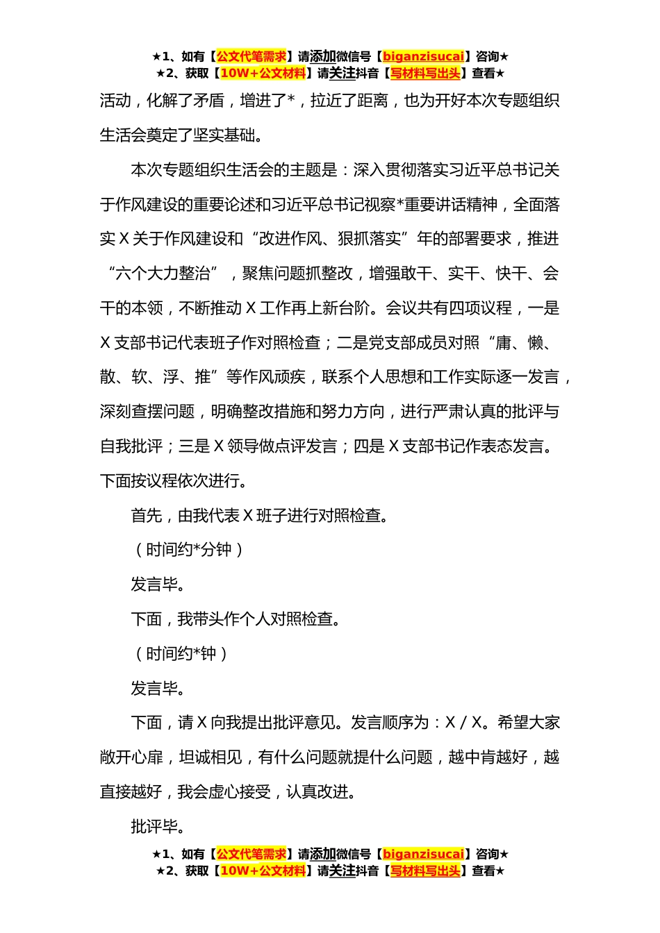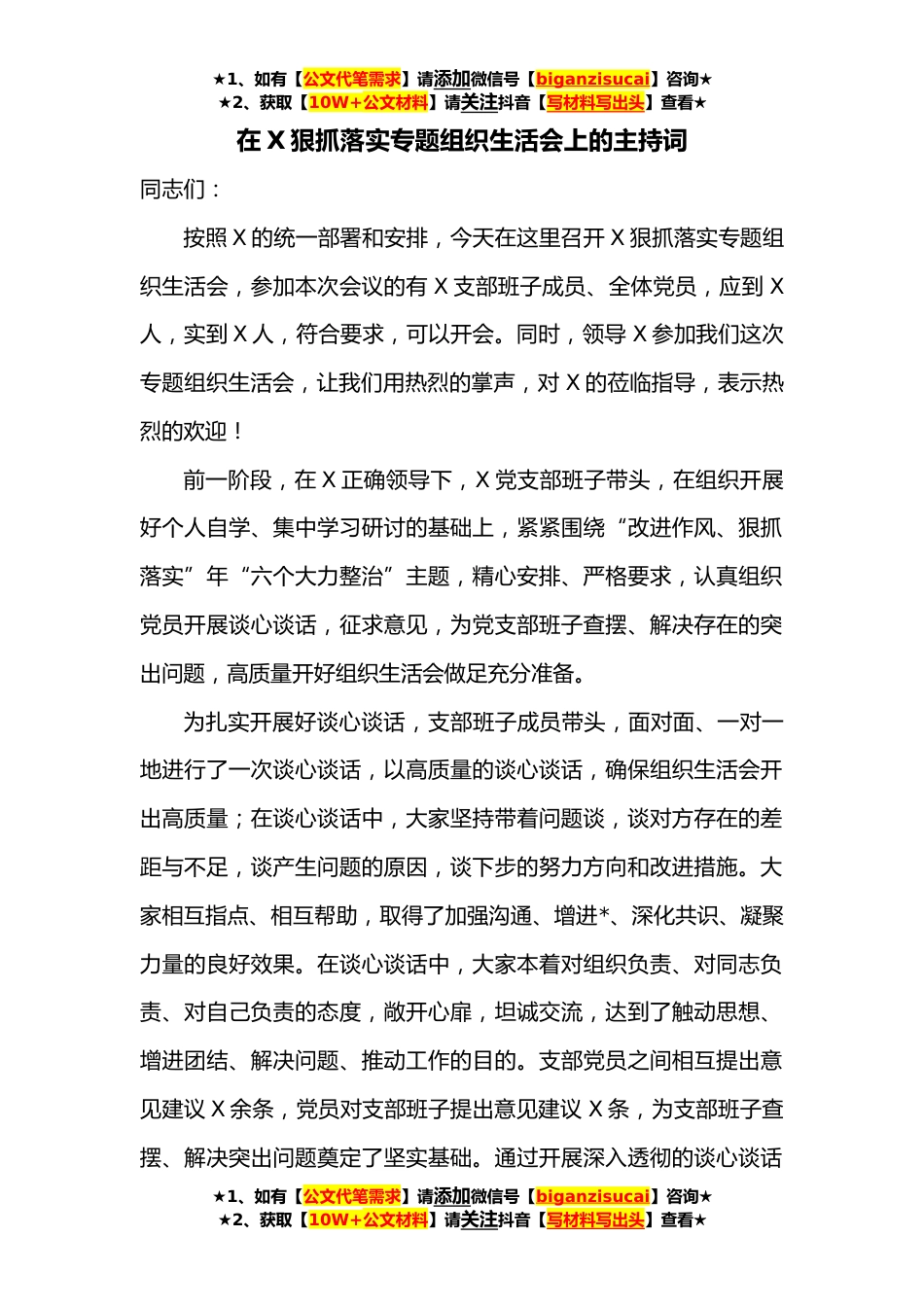 ★1、如有【公文代笔需求】请添加微信号【biganzisucai】咨询★★2、获取【10W+公文材料】请关注抖音【写材料写出头】查看★在X狠抓落实专题组织生活会上的主持词同志们:按照X的统一部署和安排,今天在这里召开X狠抓落实专题组织生活会,参加本次会议的有X支部班子成员、全体党员,应到X人,实到X人,符合要求,可以开会。同时,领导X参加我们这次专题组织生活会,让我们用热烈的掌声,对X的莅临指导,表示热烈的欢迎!前一阶段,在X正确领导下,X党支部班子带头,在组织开展好个人自学、集中学习研讨的基础上,紧紧围绕“改进作风、狠抓落实”年“六个大力整治”主题,精心安排、严格要求,认真组织党员开展谈心谈话,征求意见,为党支部班子查摆、解决存在的突出问题,高质量开好组织生活会做足充分准备。为扎...