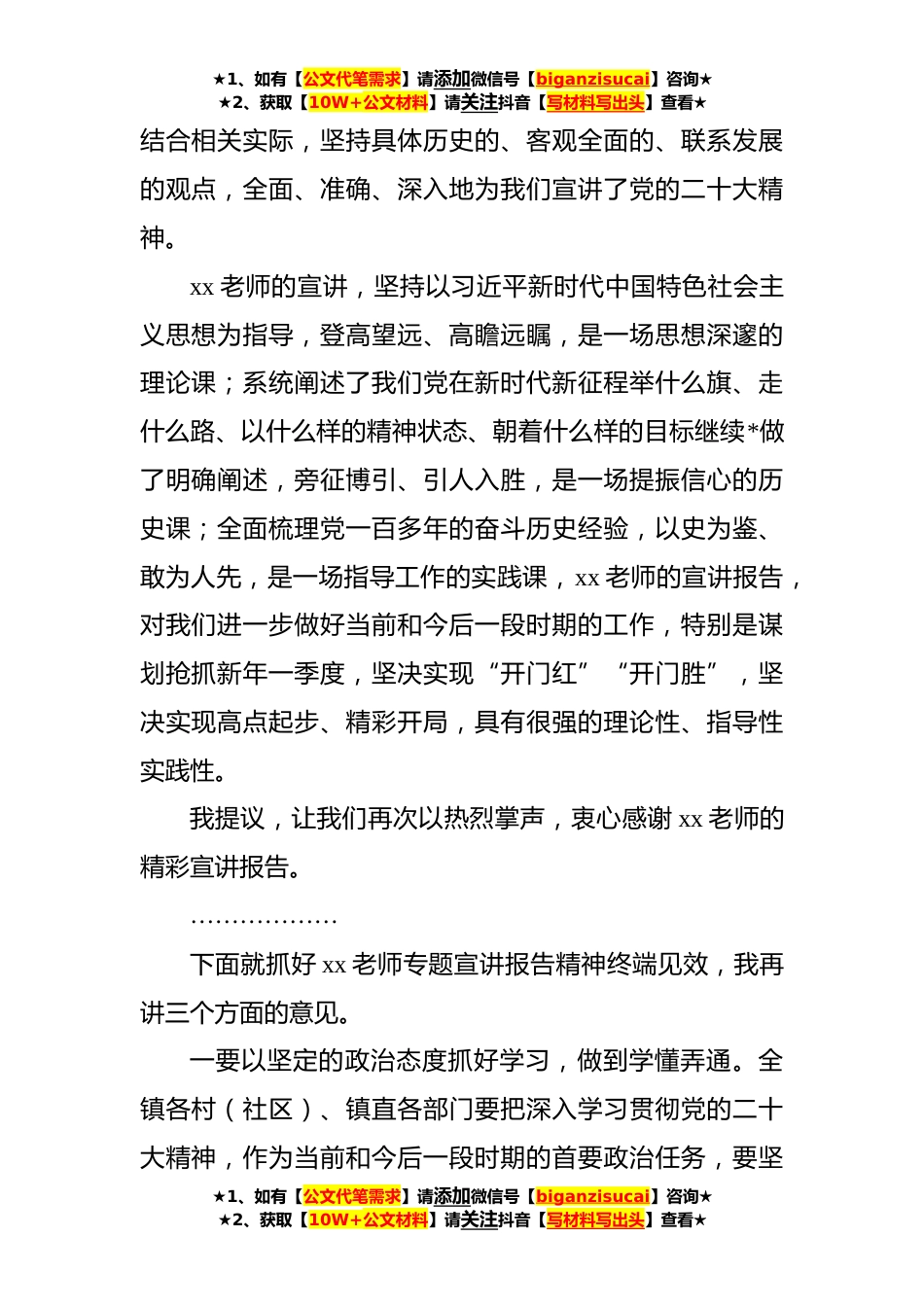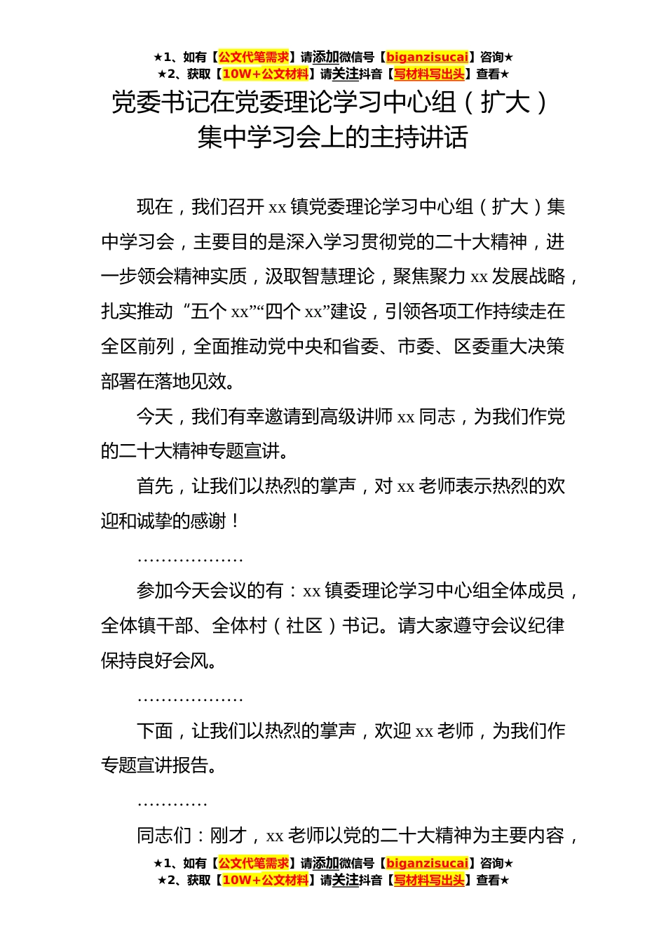 ★1、如有【公文代笔需求】请添加微信号【biganzisucai】咨询★★2、获取【10W+公文材料】请关注抖音【写材料写出头】查看★党委书记在党委理论学习中心组(扩大)集中学习会上的主持讲话现在,我们召开xx镇党委理论学习中心组(扩大)集中学习会,主要目的是深入学习贯彻党的二十大精神,进一步领会精神实质,汲取智慧理论,聚焦聚力xx发展战略,扎实推动“五个xx”“四个xx”建设,引领各项工作持续走在全区前列,全面推动党中央和省委、市委、区委重大决策部署在落地见效。今天,我们有幸邀请到高级讲师xx同志,为我们作党的二十大精神专题宣讲。首先,让我们以热烈的掌声,对xx老师表示热烈的欢迎和诚挚的感谢!………………参加今天会议的有:xx镇委理论学习中心组全体成员,全体镇干部、全体村(社区)书记...