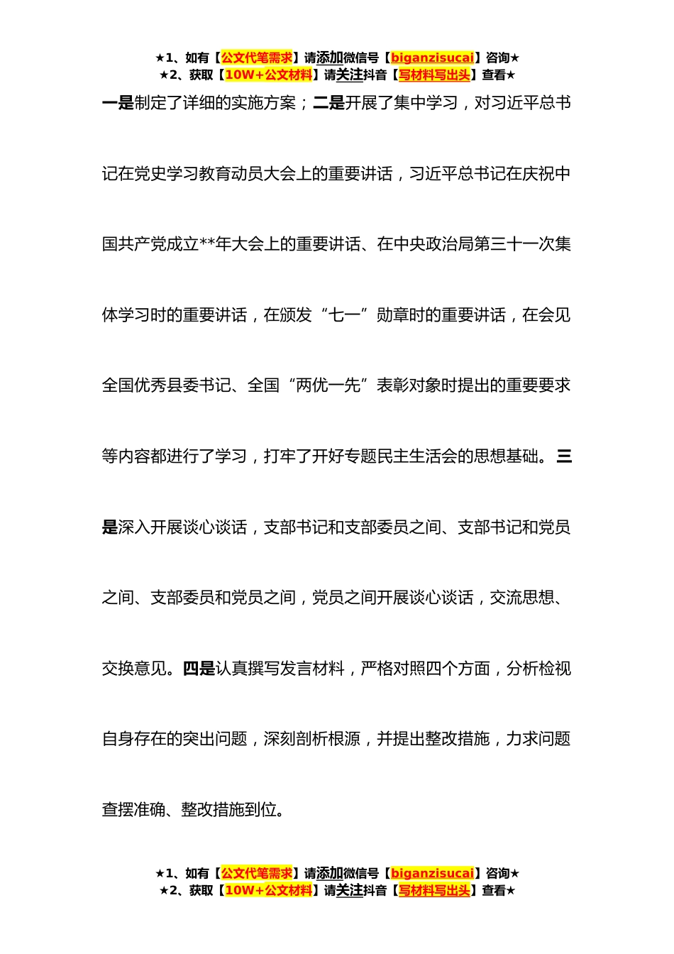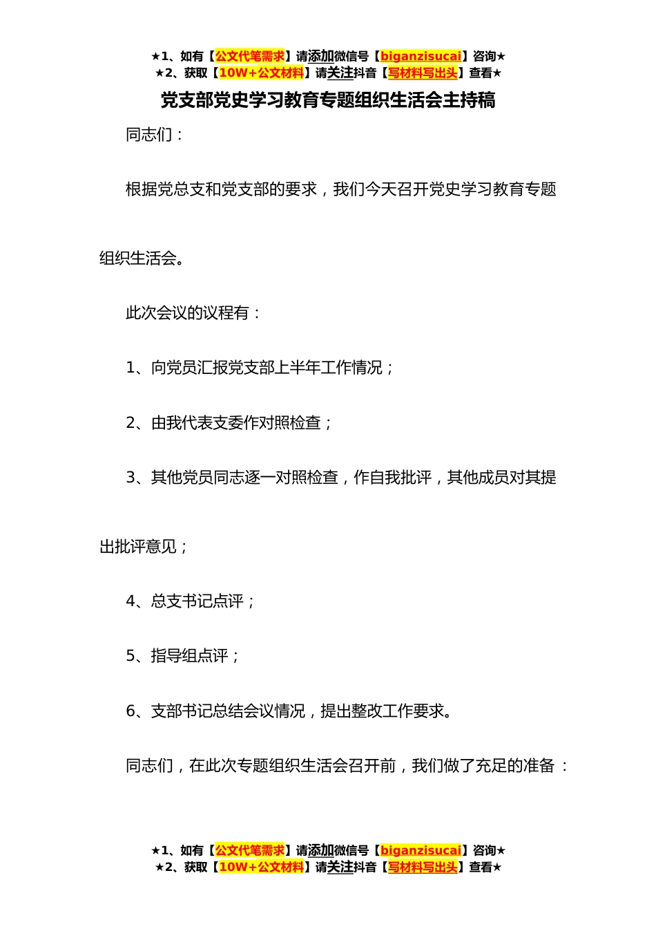 ★1、如有【公文代笔需求】请添加微信号【biganzisucai】咨询★★2、获取【10W+公文材料】请关注抖音【写材料写出头】查看★党支部党史学习教育专题组织生活会主持稿同志们:根据党总支和党支部的要求,我们今天召开党史学习教育专题组织生活会。此次会议的议程有:1、向党员汇报党支部上半年工作情况;2、由我代表支委作对照检查;3、其他党员同志逐一对照检查,作自我批评,其他成员对其提出批评意见;4、总支书记点评;5、指导组点评;6、支部书记总结会议情况,提出整改工作要求。同志们,在此次专题组织生活会召开前,我们做了充足的准备:★1、如有【公文代笔需求】请添加微信号【biganzisucai】咨询★★2、获取【10W+公文材料】请关注抖音【写材料写出头】查看★★1、如有【公文代笔需求】请添加微信号【bi...