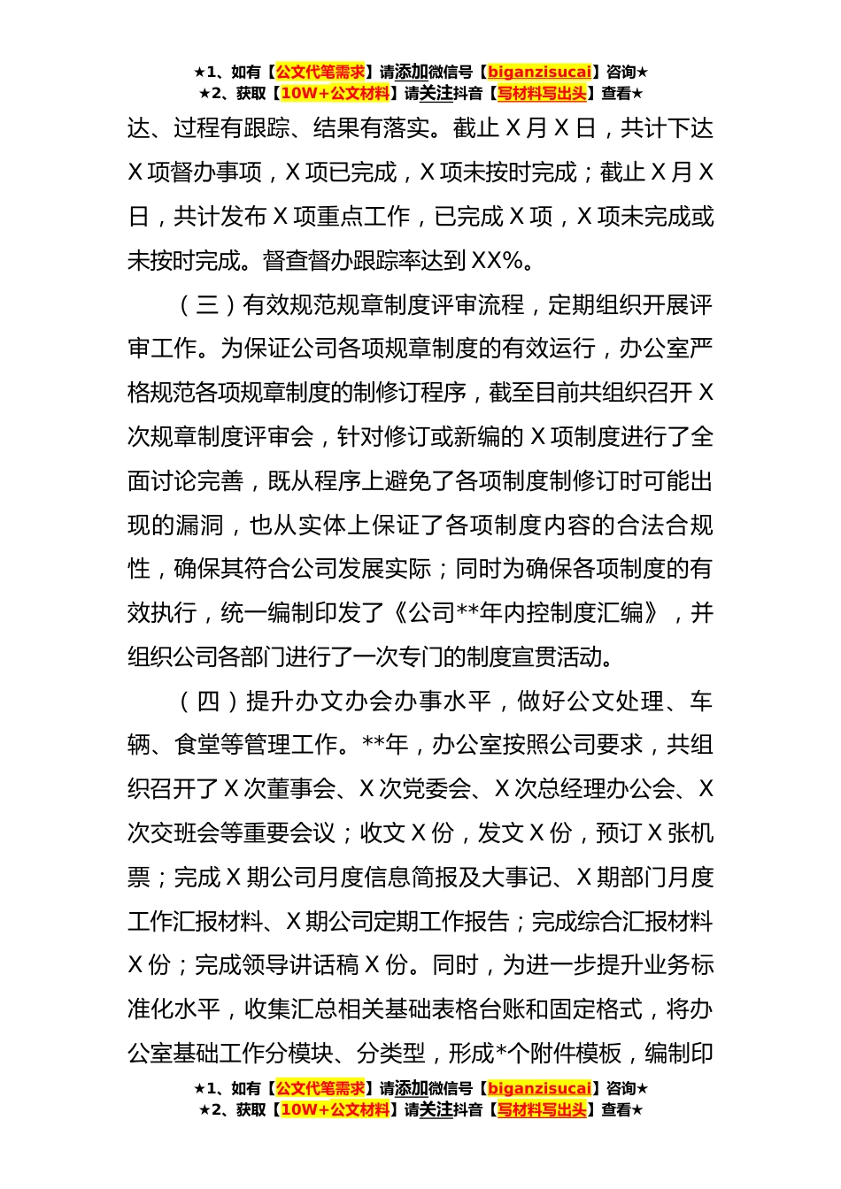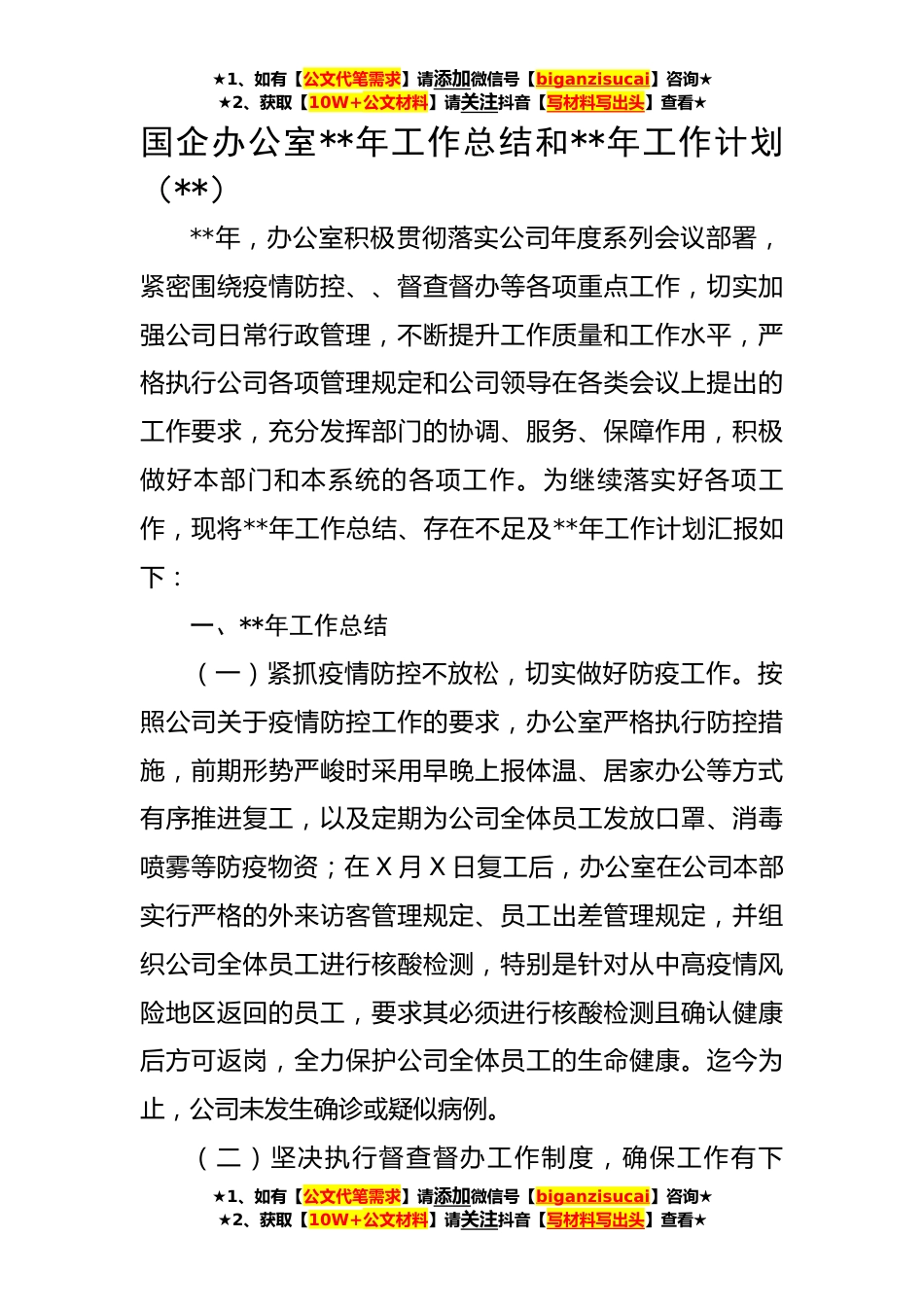 ★1、如有【公文代笔需求】请添加微信号【biganzisucai】咨询★★2、获取【10W+公文材料】请关注抖音【写材料写出头】查看★国企办公室**年工作总结和**年工作计划(**)**年,办公室积极贯彻落实公司年度系列会议部署,紧密围绕疫情防控、、督查督办等各项重点工作,切实加强公司日常行政管理,不断提升工作质量和工作水平,严格执行公司各项管理规定和公司领导在各类会议上提出的工作要求,充分发挥部门的协调、服务、保障作用,积极做好本部门和本系统的各项工作。为继续落实好各项工作,现将**年工作总结、存在不足及**年工作计划汇报如下:一、**年工作总结(一)紧抓疫情防控不放松,切实做好防疫工作。按照公司关于疫情防控工作的要求,办公室严格执行防控措施,前期形势严峻时采用早晚上报体温、居家办公...