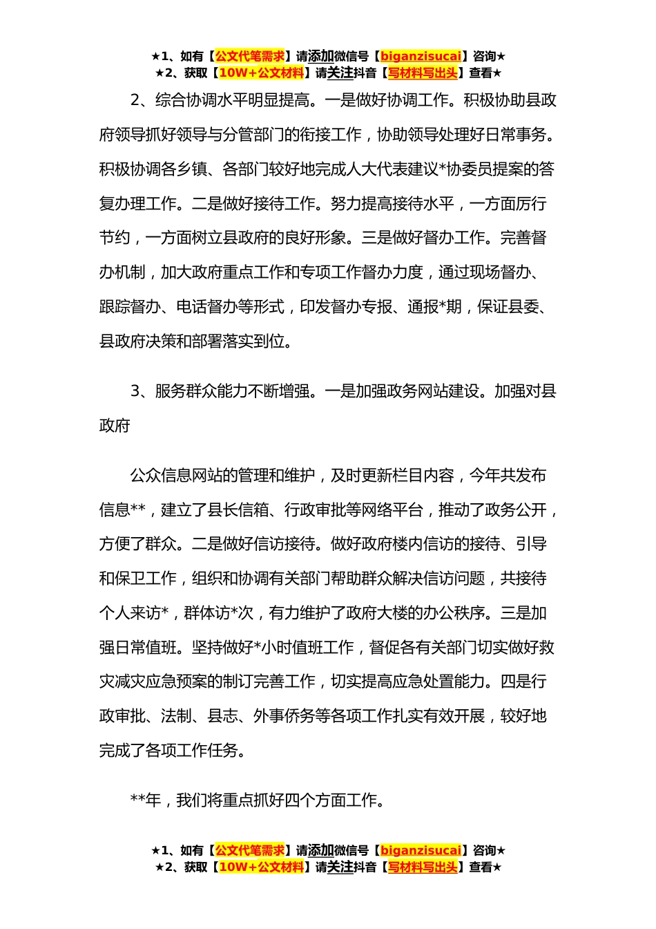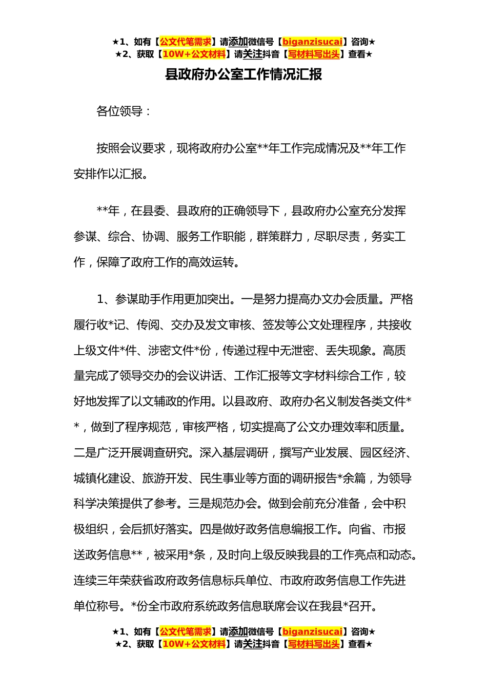 ★1、如有【公文代笔需求】请添加微信号【biganzisucai】咨询★★2、获取【10W+公文材料】请关注抖音【写材料写出头】查看★县政府办公室工作情况汇报各位领导:按照会议要求,现将政府办公室**年工作完成情况及**年工作安排作以汇报。**年,在县委、县政府的正确领导下,县政府办公室充分发挥参谋、综合、协调、服务工作职能,群策群力,尽职尽责,务实工作,保障了政府工作的高效运转。1、参谋助手作用更加突出。一是努力提高办文办会质量。严格履行收*记、传阅、交办及发文审核、签发等公文处理程序,共接收上级文件*件、涉密文件*份,传递过程中无泄密、丢失现象。高质量完成了领导交办的会议讲话、工作汇报等文字材料综合工作,较好地发挥了以文辅政的作用。以县政府、政府办名义制发各类文件**,做到了程序...