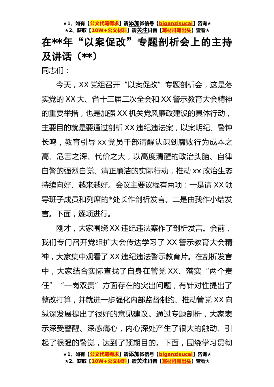 ★1、如有【公文代笔需求】请添加微信号【biganzisucai】咨询★★2、获取【10W+公文材料】请关注抖音【写材料写出头】查看★在**年“以案促改”专题剖析会上的主持及讲话(**)同志们:今天,XX党组召开“以案促改”专题剖析会,这是落实党的XX大、省十三届二次全会和XX警示教育大会精神的重要举措,也是加强XX机关党风廉政建设的具体行动,主要目的就是要通过剖析XX违纪违法案,以案明纪、警钟长鸣,教育引导xx党员干部清醒认识到腐败行为成本之高、危害之深、代价之大,以高度清醒的政治头脑、自律自警的强烈自觉、清正廉洁的实际行动,推动xx政治生态持续向好、越来越好。会议主要议程有两项:一是请XX领导班子成员和列席的*处长作剖析发言。二是由我作小结发言。下面,逐项进行。刚才,大家围绕XX违纪违法案作...
