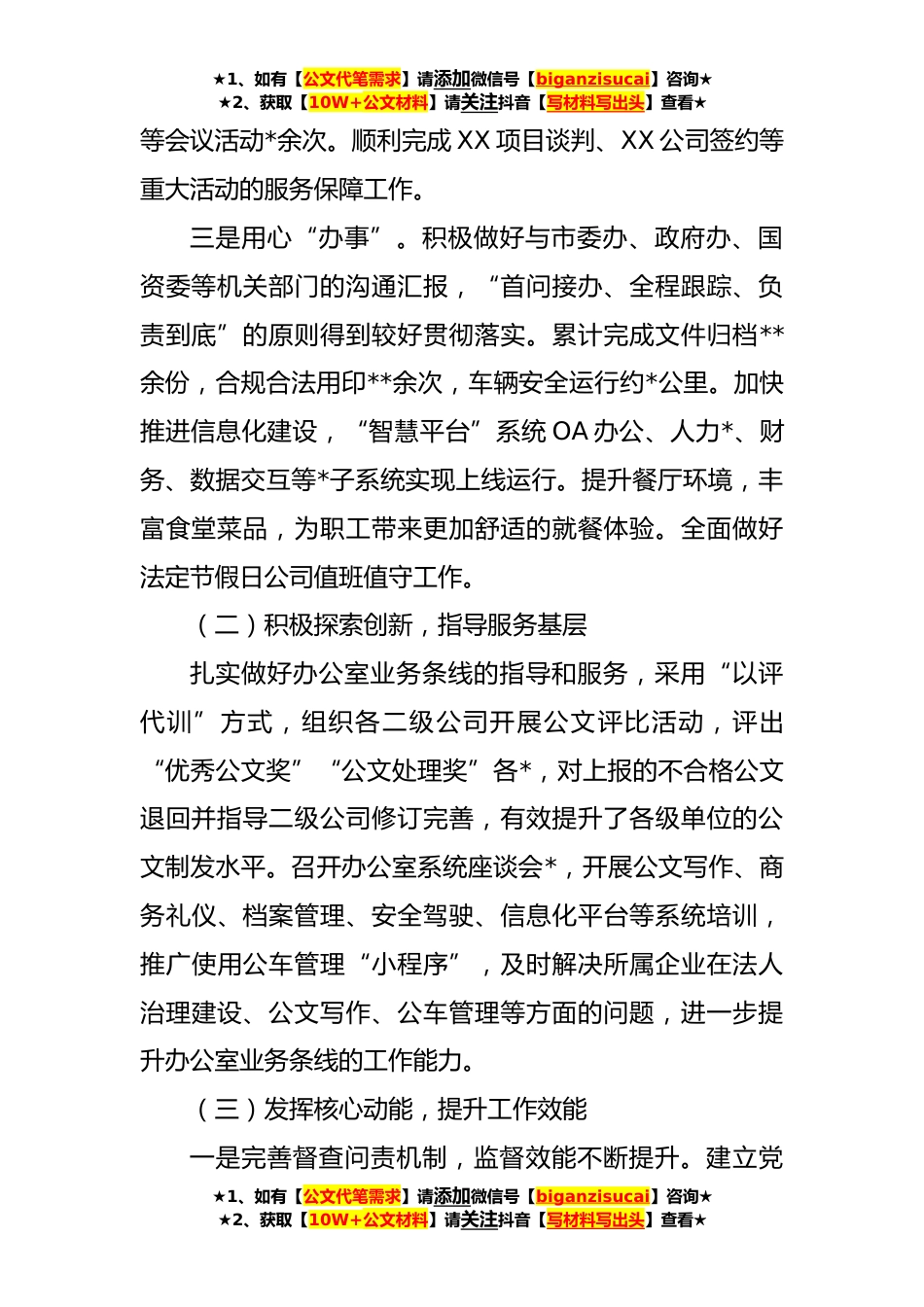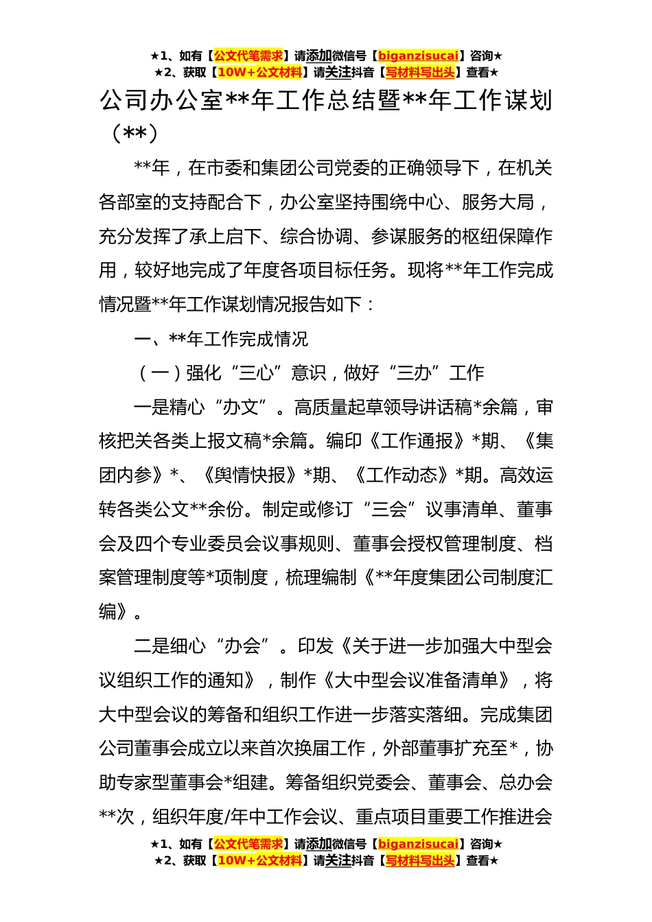 ★1、如有【公文代笔需求】请添加微信号【biganzisucai】咨询★★2、获取【10W+公文材料】请关注抖音【写材料写出头】查看★公司办公室**年工作总结暨**年工作谋划(**)**年,在市委和集团公司党委的正确领导下,在机关各部室的支持配合下,办公室坚持围绕中心、服务大局,充分发挥了承上启下、综合协调、参谋服务的枢纽保障作用,较好地完成了年度各项目标任务。现将**年工作完成情况暨**年工作谋划情况报告如下:一、**年工作完成情况(一)强化“三心”意识,做好“三办”工作一是精心“办文”。高质量起草领导讲话稿*余篇,审核把关各类上报文稿*余篇。编印《工作通报》*期、《集团内参》*、《舆情快报》*期、《工作动态》*期。高效运转各类公文**余份。制定或修订“三会”议事清单、董事会及四个专业委员会...