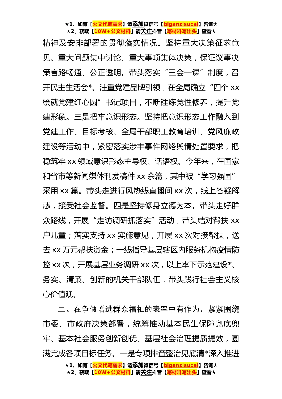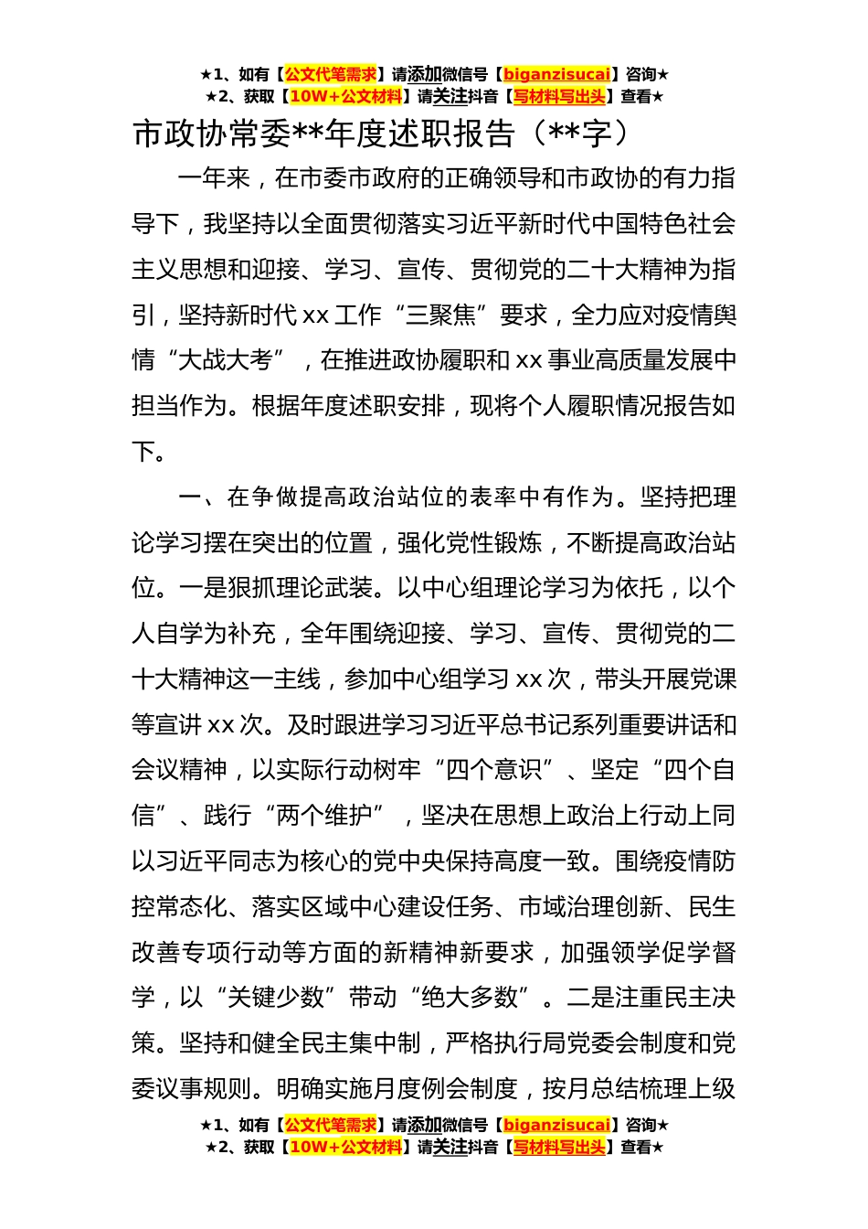 ★1、如有【公文代笔需求】请添加微信号【biganzisucai】咨询★★2、获取【10W+公文材料】请关注抖音【写材料写出头】查看★市政协常委**年度述职报告(**字)一年来,在市委市政府的正确领导和市政协的有力指导下,我坚持以全面贯彻落实习近平新时代中国特色社会主义思想和迎接、学习、宣传、贯彻党的二十大精神为指引,坚持新时代xx工作“三聚焦”要求,全力应对疫情舆情“大战大考”,在推进政协履职和xx事业高质量发展中担当作为。根据年度述职安排,现将个人履职情况报告如下。一、在争做提高政治站位的表率中有作为。坚持把理论学习摆在突出的位置,强化党性锻炼,不断提高政治站位。一是狠抓理论武装。以中心组理论学习为依托,以个人自学为补充,全年围绕迎接、学习、宣传、贯彻党的二十大精神这一主线,...