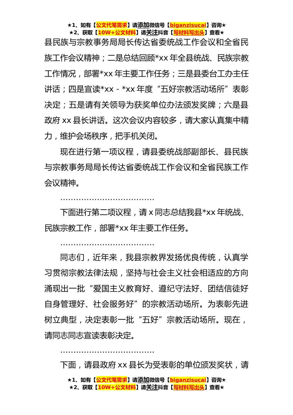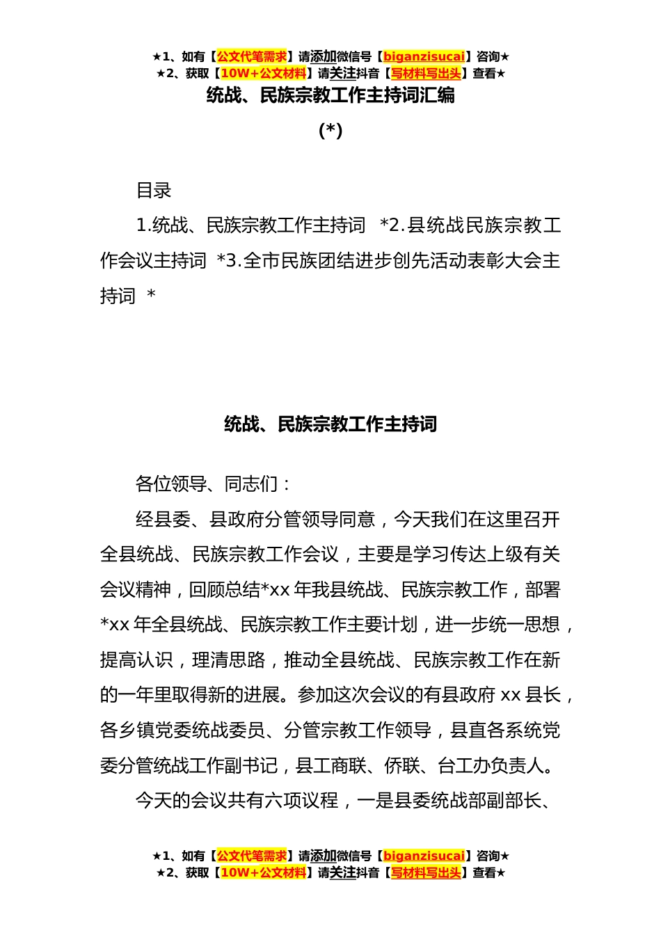 ★1、如有【公文代笔需求】请添加微信号【biganzisucai】咨询★★2、获取【10W+公文材料】请关注抖音【写材料写出头】查看★统战、民族宗教工作主持词汇编(*)目录1.统战、民族宗教工作主持词*2.县统战民族宗教工作会议主持词*3.全市民族团结进步创先活动表彰大会主持词*统战、民族宗教工作主持词各位领导、同志们:经县委、县政府分管领导同意,今天我们在这里召开全县统战、民族宗教工作会议,主要是学习传达上级有关会议精神,回顾总结*xx年我县统战、民族宗教工作,部署*xx年全县统战、民族宗教工作主要计划,进一步统一思想,提高认识,理清思路,推动全县统战、民族宗教工作在新的一年里取得新的进展。参加这次会议的有县政府xx县长,各乡镇党委统战委员、分管宗教工作领导,县直各系统党委分管统战工作副...