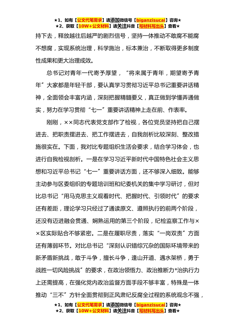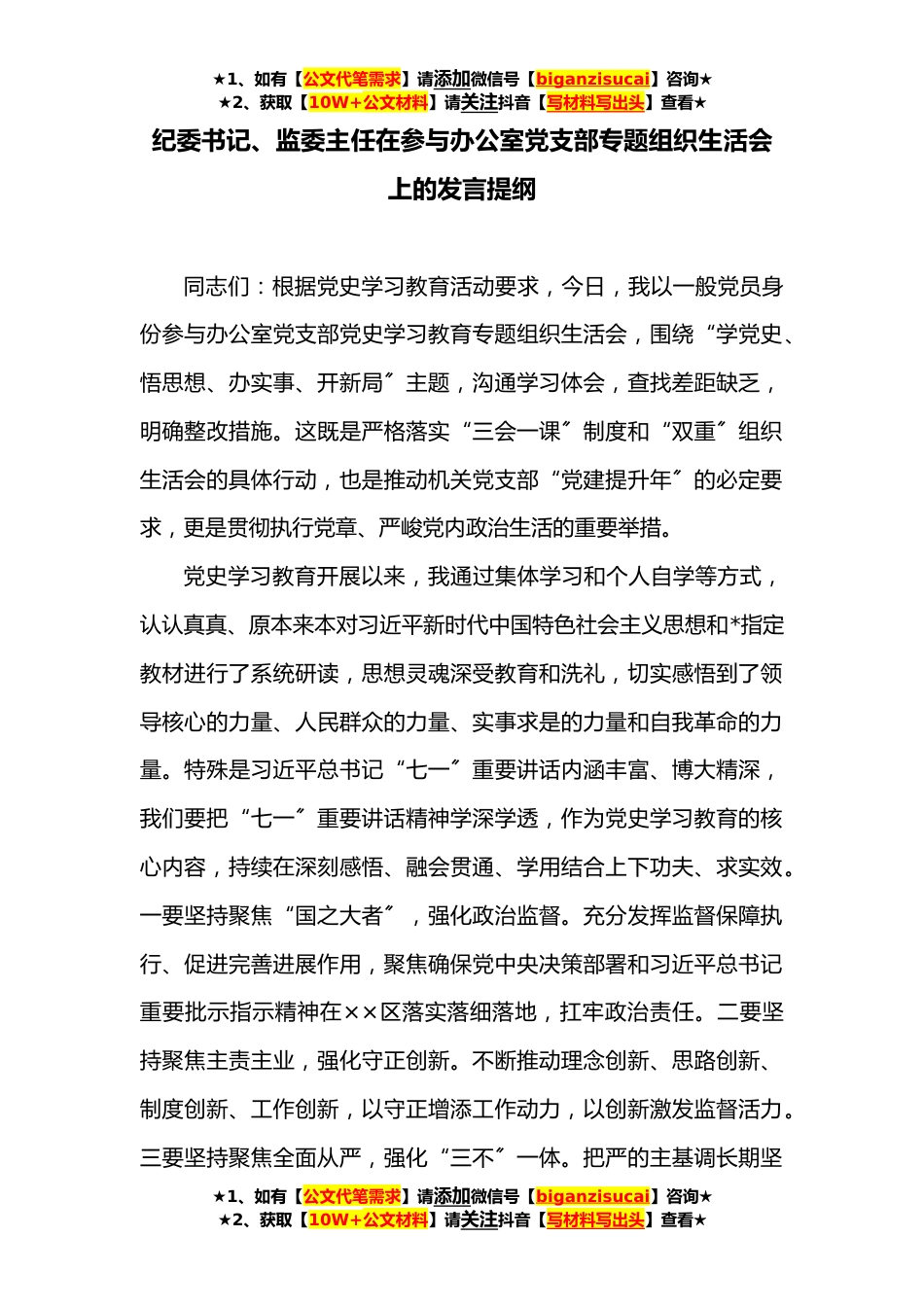 ★1、如有【公文代笔需求】请添加微信号【biganzisucai】咨询★★2、获取【10W+公文材料】请关注抖音【写材料写出头】查看★纪委书记、监委主任在参与办公室党支部专题组织生活会上的发言提纲同志们:根据党史学习教育活动要求,今日,我以一般党员身份参与办公室党支部党史学习教育专题组织生活会,围绕“学党史、悟思想、办实事、开新局〞主题,沟通学习体会,查找差距缺乏,明确整改措施。这既是严格落实“三会一课〞制度和“双重〞组织生活会的具体行动,也是推动机关党支部“党建提升年〞的必定要求,更是贯彻执行党章、严峻党内政治生活的重要举措。党史学习教育开展以来,我通过集体学习和个人自学等方式,认认真真、原本来本对习近平新时代中国特色社会主义思想和*指定教材进行了系统研读,思想灵魂深受教...