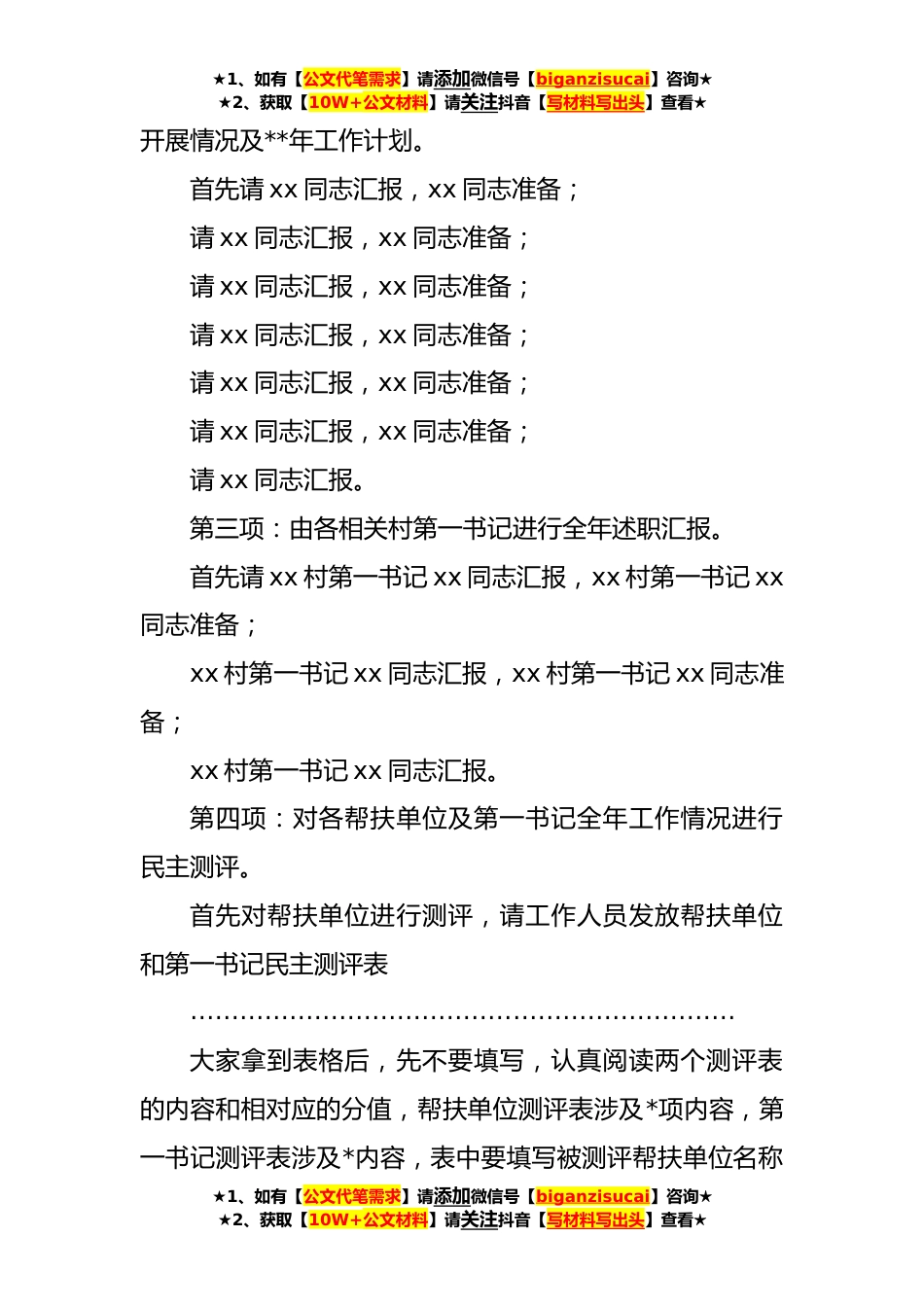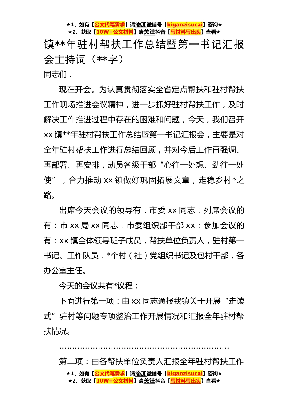 ★1、如有【公文代笔需求】请添加微信号【biganzisucai】咨询★★2、获取【10W+公文材料】请关注抖音【写材料写出头】查看★镇**年驻村帮扶工作总结暨第一书记汇报会主持词(**字)同志们:现在开会。为认真贯彻落实全省定点帮扶和驻村帮扶工作现场推进会议精神,进一步抓好驻村帮扶工作,及时解决工作推进过程中存在的困难和问题,今天,我们召开xx镇**年驻村帮扶工作总结暨第一书记汇报会,主要是对全年驻村帮扶工作进行总结回顾,并对今后工作再强调、再部署、再安排,动员各级干部“心往一处想、劲往一处使”,合力推动xx镇做好巩固拓展文章,走稳乡村*之路。出席今天会议的领导有:市委xx同志;列席会议的有:市xx局xx同志,市委组织部干部xx;参加会议的有:xx镇全体领导班子成员,帮扶单位负责人,驻村第一...