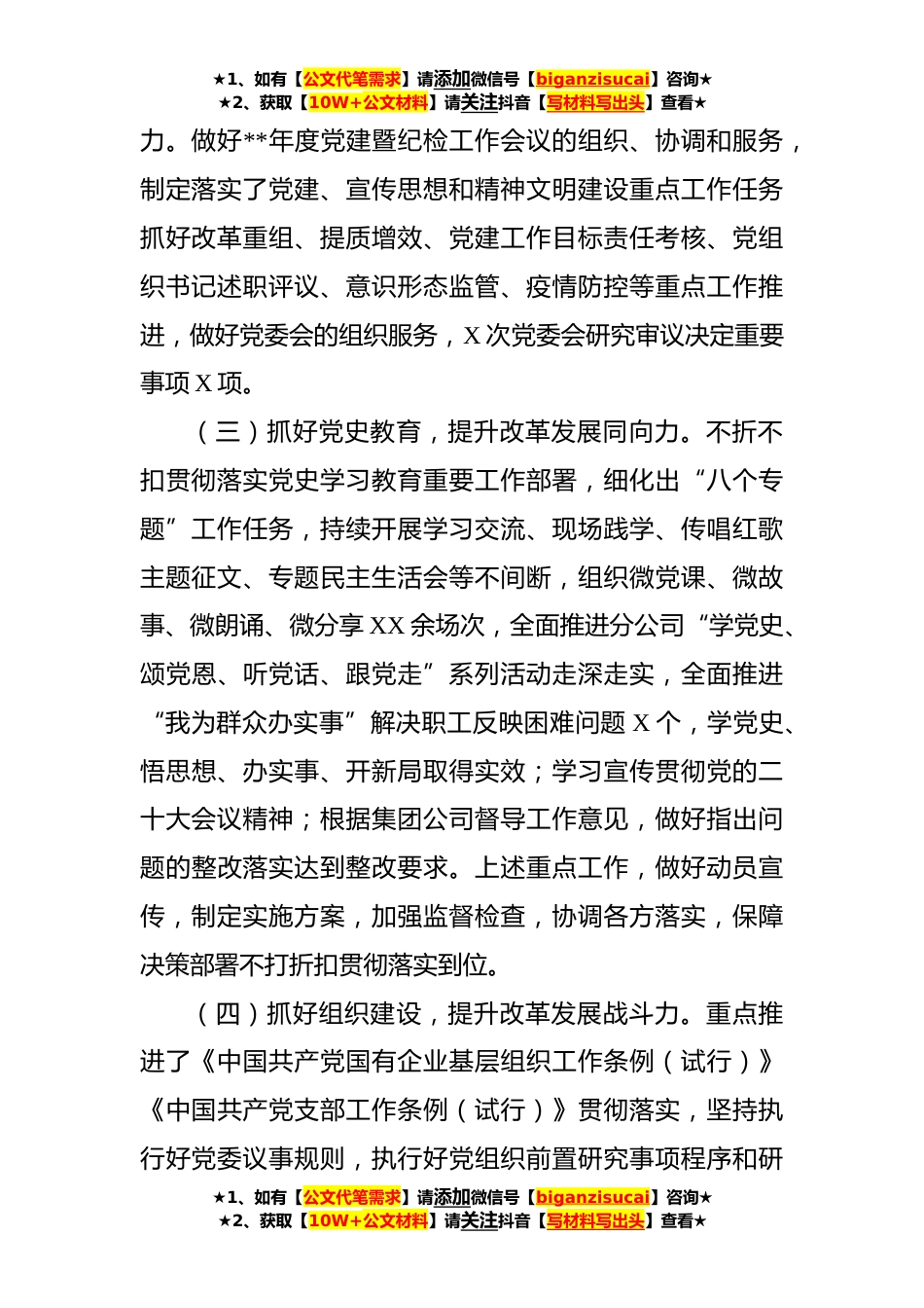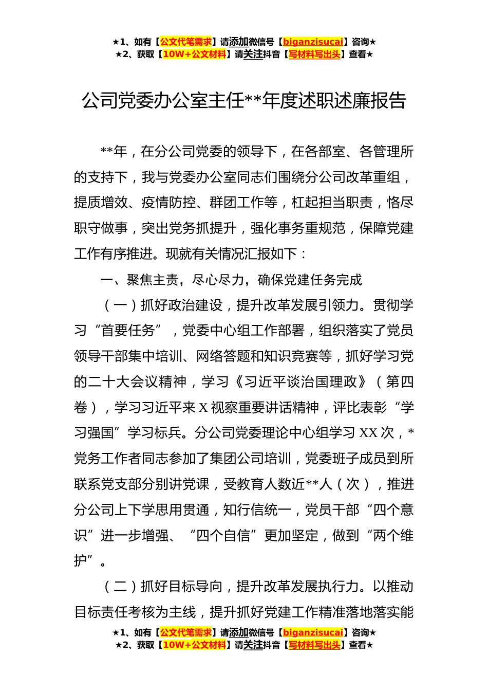 ★1、如有【公文代笔需求】请添加微信号【biganzisucai】咨询★★2、获取【10W+公文材料】请关注抖音【写材料写出头】查看★公司党委办公室主任**年度述职述廉报告**年,在分公司党委的领导下,在各部室、各管理所的支持下,我与党委办公室同志们围绕分公司改革重组,提质增效、疫情防控、群团工作等,杠起担当职责,恪尽职守做事,突出党务抓提升,强化事务重规范,保障党建工作有序推进。现就有关情况汇报如下:一、聚焦主责,尽心尽力,确保党建任务完成(一)抓好政治建设,提升改革发展引领力。贯彻学习“首要任务”,党委中心组工作部署,组织落实了党员领导干部集中培训、网络答题和知识竞赛等,抓好学习党的二十大会议精神,学习《习近平谈治国理政》(第四卷),学习习近平来X视察重要讲话精神,评比表彰...