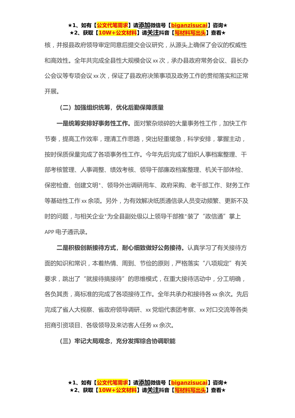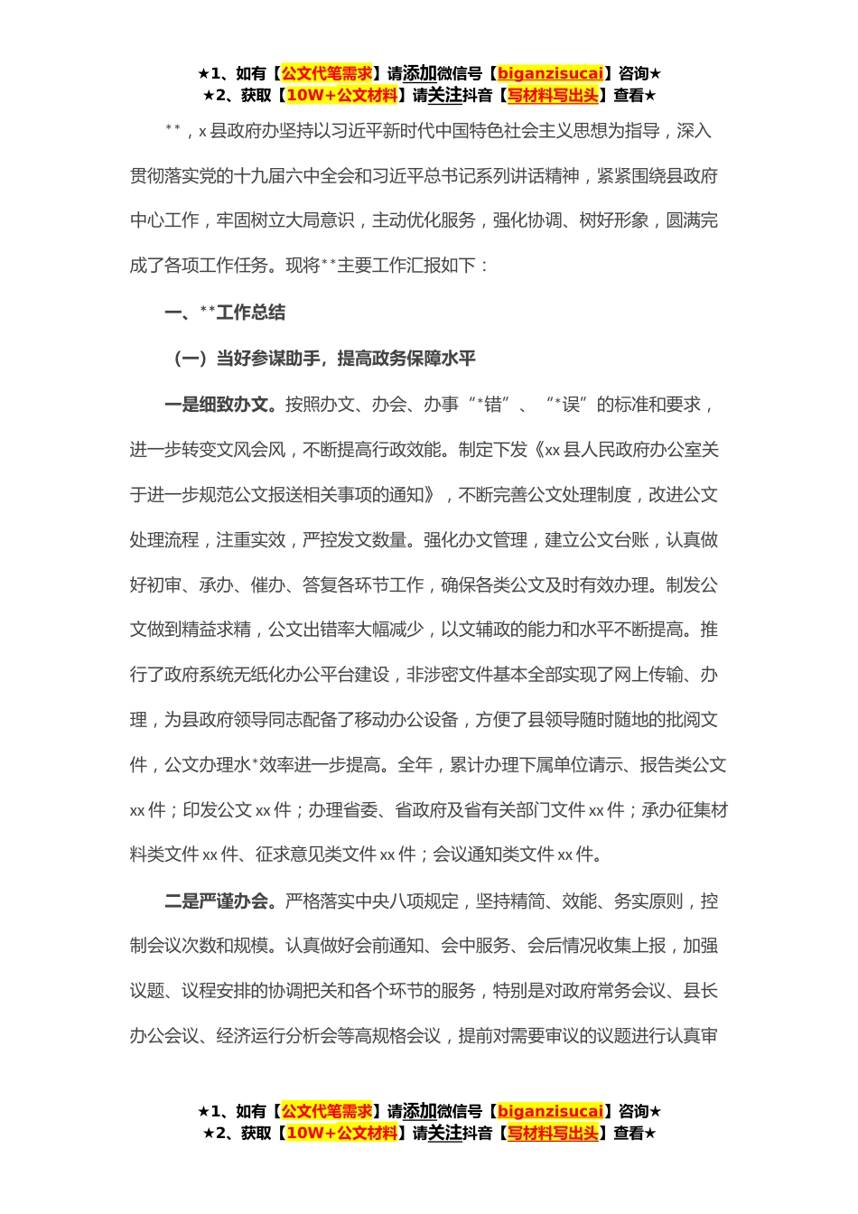 ★1、如有【公文代笔需求】请添加微信号【biganzisucai】咨询★★2、获取【10W+公文材料】请关注抖音【写材料写出头】查看★**,x县政府办坚持以习近平新时代中国特色社会主义思想为指导,深入贯彻落实党的十九届六中全会和习近平总书记系列讲话精神,紧紧围绕县政府中心工作,牢固树立大局意识,主动优化服务,强化协调、树好形象,圆满完成了各项工作任务。现将**主要工作汇报如下:一、**工作总结(一)当好参谋助手,提高政务保障水平一是细致办文。按照办文、办会、办事“*错”、“*误”的标准和要求,进一步转变文风会风,不断提高行政效能。制定下发《xx县人民政府办公室关于进一步规范公文报送相关事项的通知》,不断完善公文处理制度,改进公文处理流程,注重实效,严控发文数量。强化办文管理,建立公文...