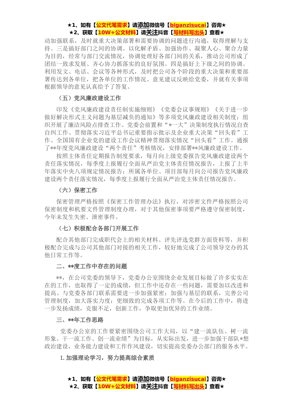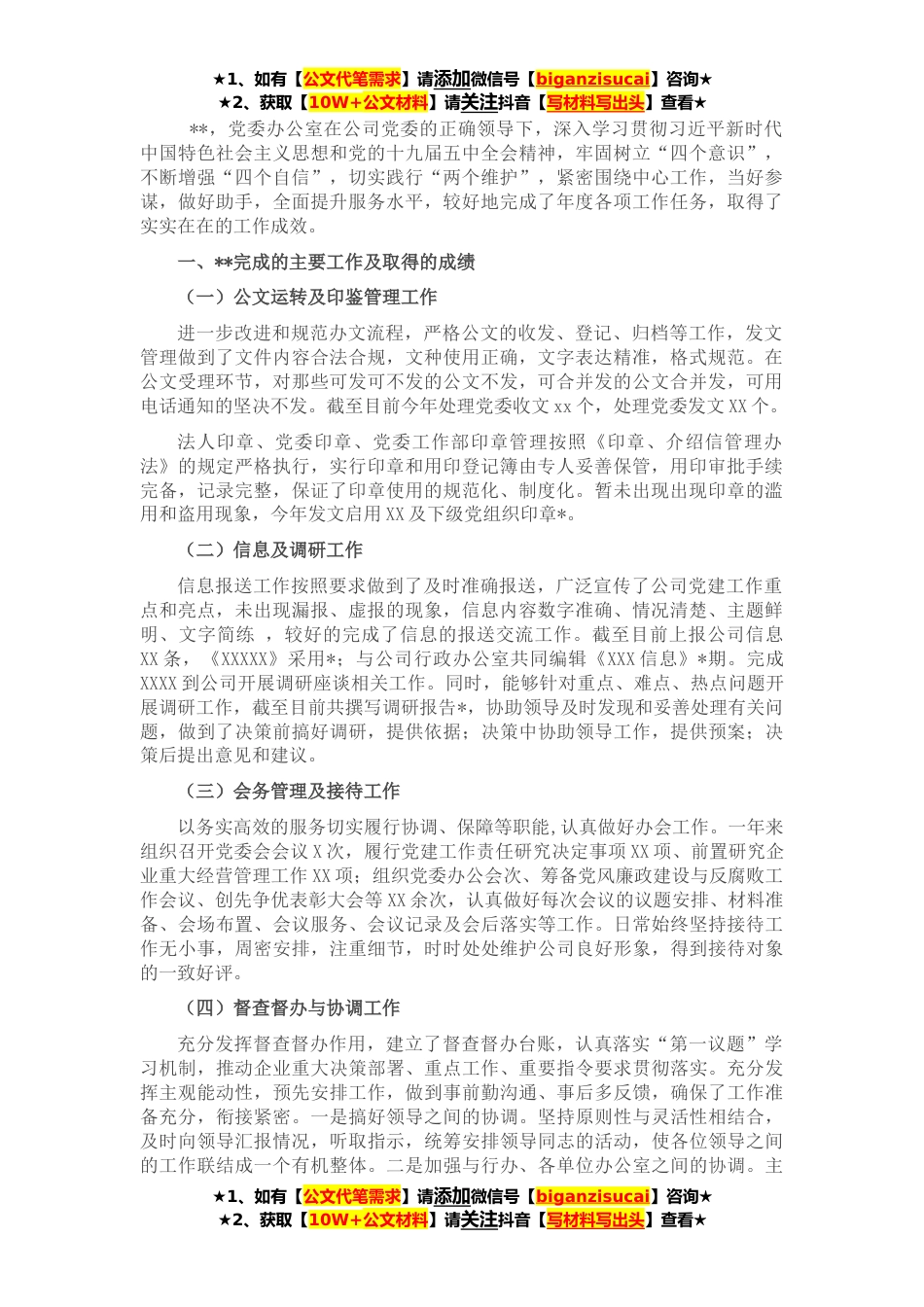 ★1、如有【公文代笔需求】请添加微信号【biganzisucai】咨询★★2、获取【10W+公文材料】请关注抖音【写材料写出头】查看★**,党委办公室在公司党委的正确领导下,深入学习贯彻习近平新时代中国特色社会主义思想和党的十九届五中全会精神,牢固树立“四个意识”,不断增强“四个自信”,切实践行“两个维护”,紧密围绕中心工作,当好参谋,做好助手,全面提升服务水平,较好地完成了年度各项工作任务,取得了实实在在的工作成效。一、**完成的主要工作及取得的成绩(一)公文运转及印鉴管理工作进一步改进和规范办文流程,严格公文的收发、登记、归档等工作,发文管理做到了文件内容合法合规,文种使用正确,文字表达精准,格式规范。在公文受理环节,对那些可发可不发的公文不发,可合并发的公文合并发,可用...