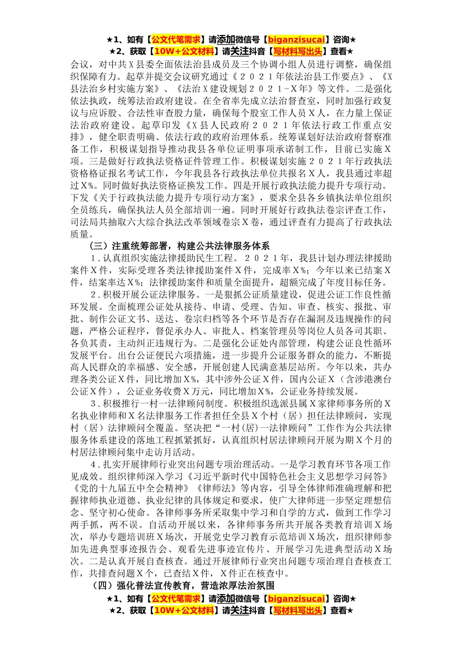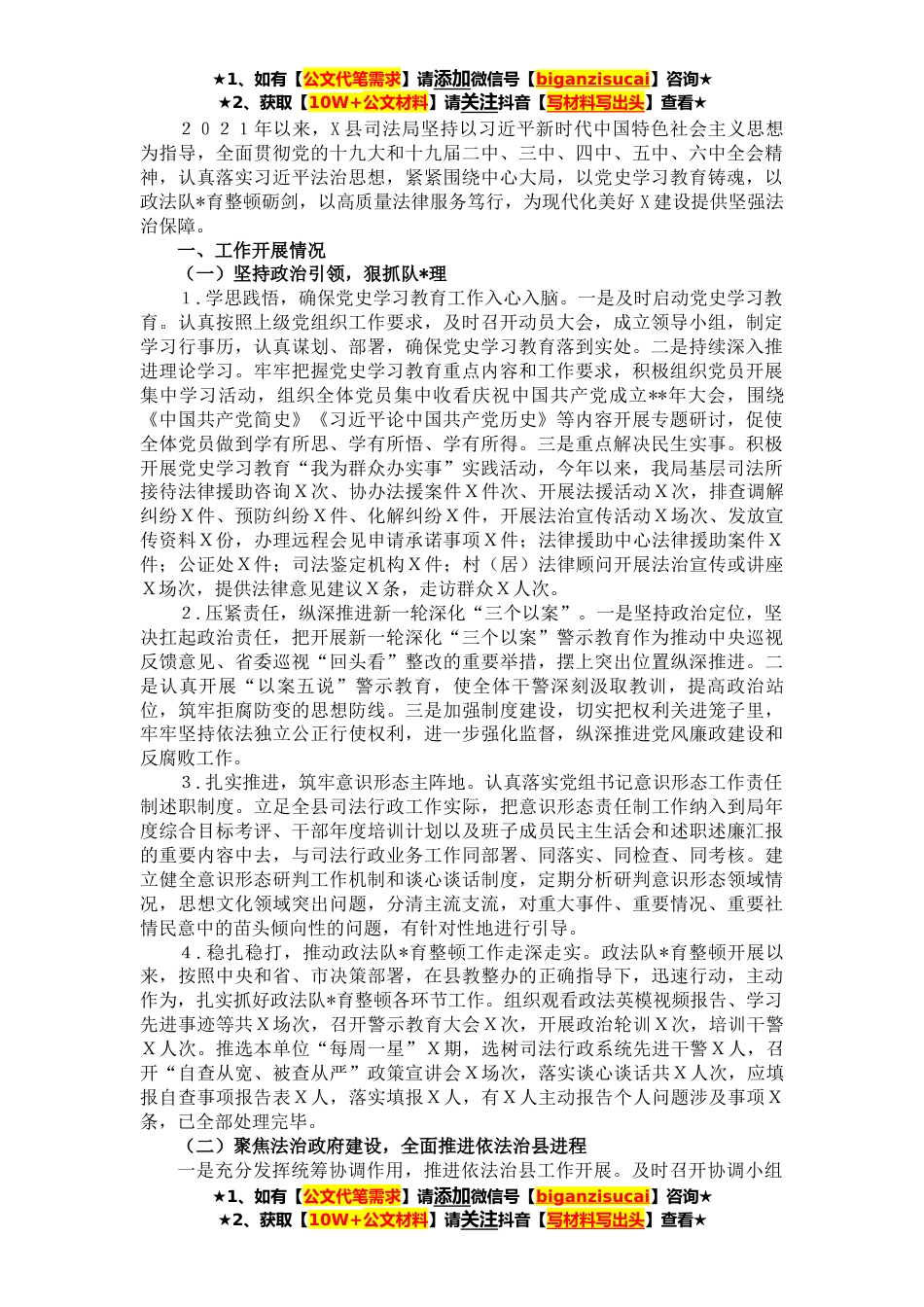 ★1、如有【公文代笔需求】请添加微信号【biganzisucai】咨询★★2、获取【10W+公文材料】请关注抖音【写材料写出头】查看★2021年以来,X县司法局坚持以习近平新时代中国特色社会主义思想为指导,全面贯彻党的十九大和十九届二中、三中、四中、五中、六中全会精神,认真落实习近平法治思想,紧紧围绕中心大局,以党史学习教育铸魂,以政法队*育整顿砺剑,以高质量法律服务笃行,为现代化美好X建设提供坚强法治保障。一、工作开展情况(一)坚持政治引领,狠抓队*理1.学思践悟,确保党史学习教育工作入心入脑。一是及时启动党史学习教育。认真按照上级党组织工作要求,及时召开动员大会,成立领导小组,制定学习行事历,认真谋划、部署,确保党史学习教育落到实处。二是持续深入推进理论学习。牢牢把握党史学...
