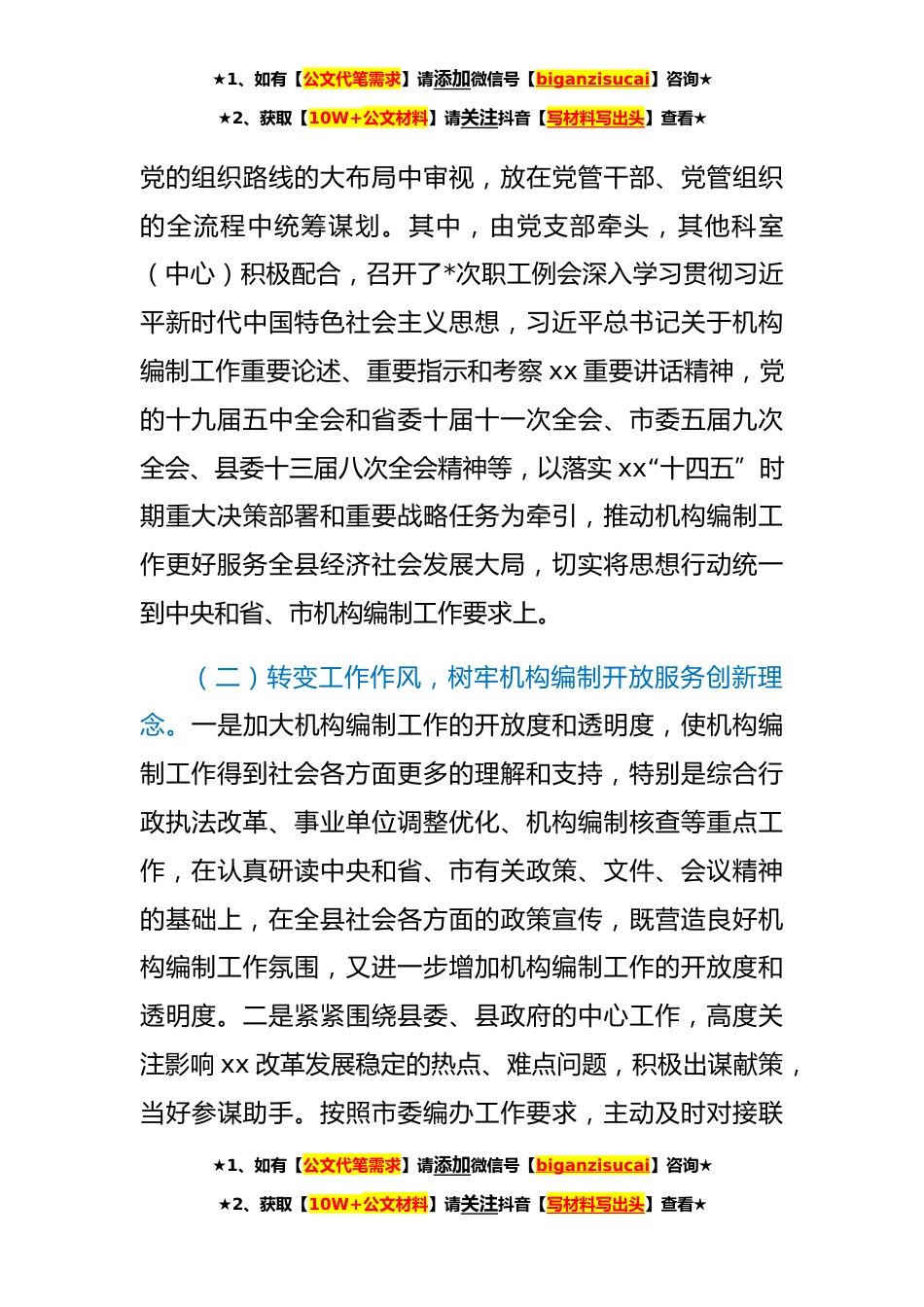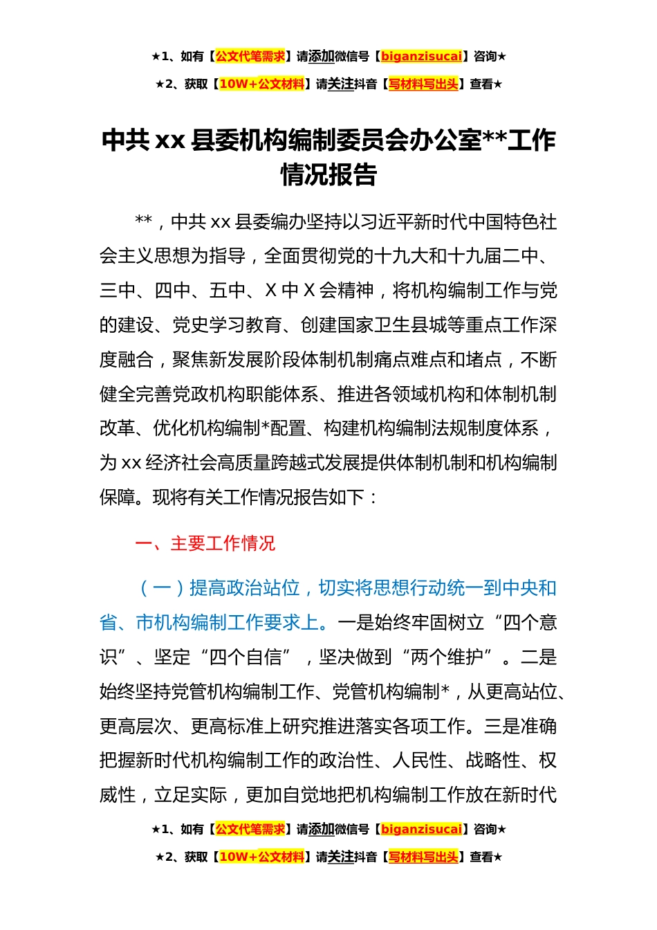 ★1、如有【公文代笔需求】请添加微信号【biganzisucai】咨询★★2、获取【10W+公文材料】请关注抖音【写材料写出头】查看★中共xx县委机构编制委员会办公室**工作情况报告**,中共xx县委编办坚持以习近平新时代中国特色社会主义思想为指导,全面贯彻党的十九大和十九届二中、三中、四中、五中、X中X会精神,将机构编制工作与党的建设、党史学习教育、创建国家卫生县城等重点工作深度融合,聚焦新发展阶段体制机制痛点难点和堵点,不断健全完善党政机构职能体系、推进各领域机构和体制机制改革、优化机构编制*配置、构建机构编制法规制度体系,为xx经济社会高质量跨越式发展提供体制机制和机构编制保障。现将有关工作情况报告如下:一、主要工作情况(一)提高政治站位,切实将思想行动统一到中央和省、市机构编制...