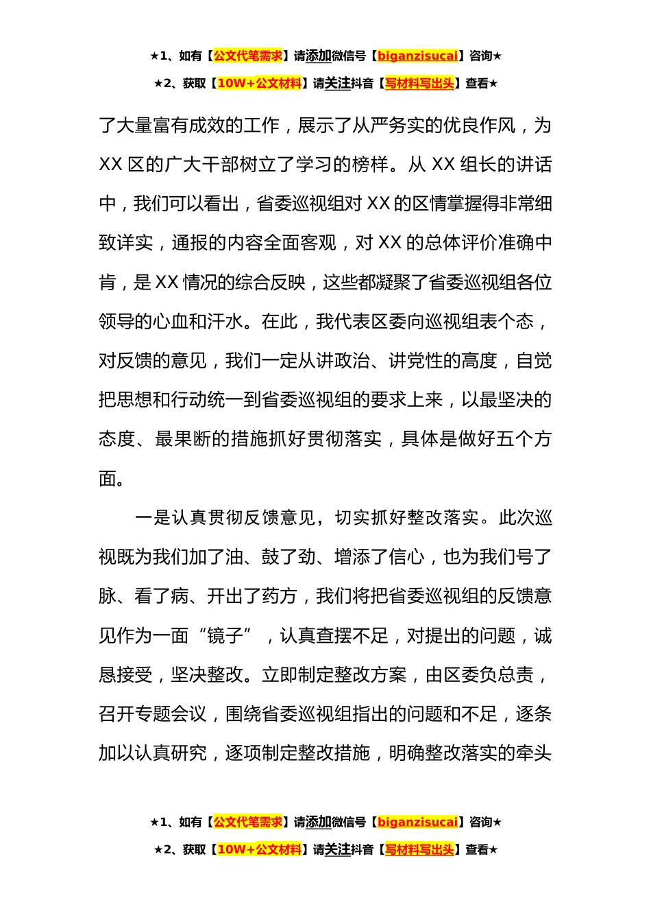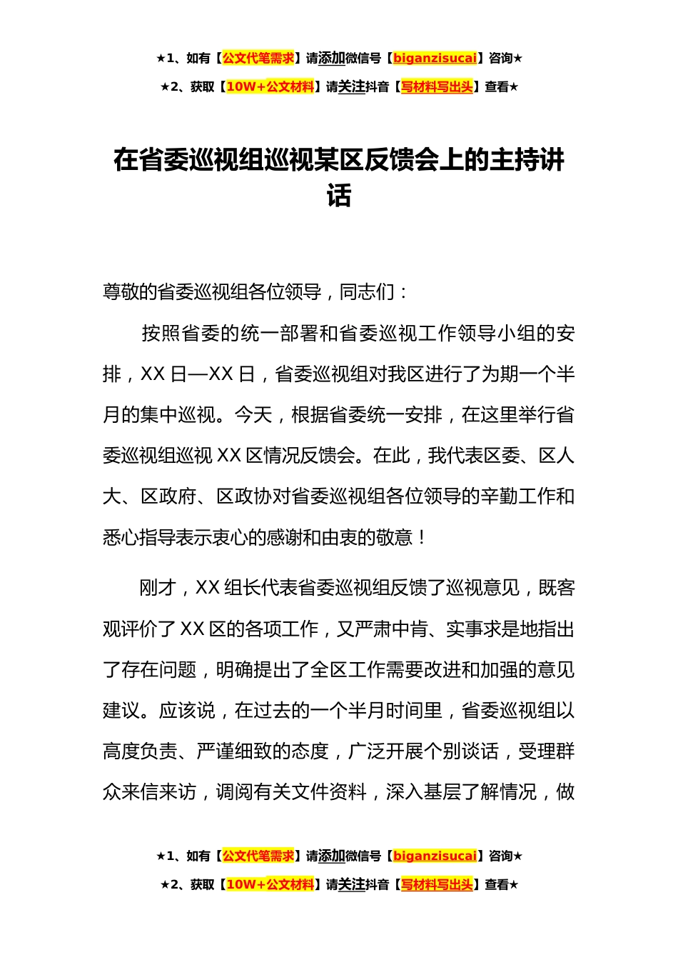 ★1、如有【公文代笔需求】请添加微信号【biganzisucai】咨询★★2、获取【10W+公文材料】请关注抖音【写材料写出头】查看★在省委巡视组巡视某区反馈会上的主持讲话尊敬的省委巡视组各位领导,同志们:按照省委的统一部署和省委巡视工作领导小组的安排,XX日—XX日,省委巡视组对我区进行了为期一个半月的集中巡视。今天,根据省委统一安排,在这里举行省委巡视组巡视XX区情况反馈会。在此,我代表区委、区人大、区政府、区政协对省委巡视组各位领导的辛勤工作和悉心指导表示衷心的感谢和由衷的敬意!刚才,XX组长代表省委巡视组反馈了巡视意见,既客观评价了XX区的各项工作,又严肃中肯、实事求是地指出了存在问题,明确提出了全区工作需要改进和加强的意见建议。应该说,在过去的一个半月时间里,省委巡视组以...