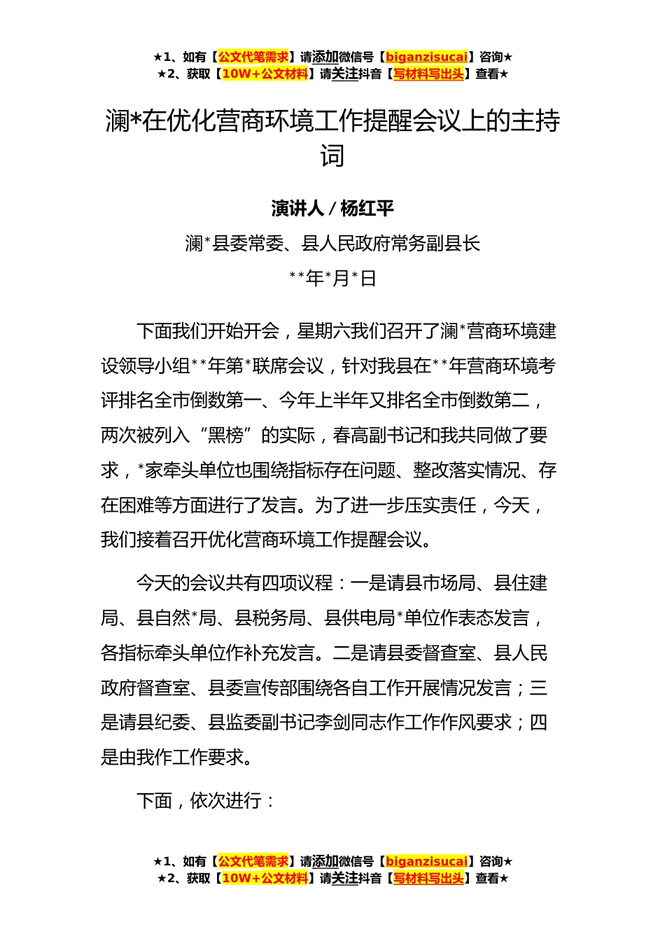 ★1、如有【公文代笔需求】请添加微信号【biganzisucai】咨询★★2、获取【10W+公文材料】请关注抖音【写材料写出头】查看★澜*在优化营商环境工作提醒会议上的主持词演讲人/杨红平澜*县委常委、县人民政府常务副县长**年*月*日下面我们开始开会,星期六我们召开了澜*营商环境建设领导小组**年第*联席会议,针对我县在**年营商环境考评排名全市倒数第一、今年上半年又排名全市倒数第二,两次被列入“黑榜”的实际,春高副书记和我共同做了要求,*家牵头单位也围绕指标存在问题、整改落实情况、存在困难等方面进行了发言。为了进一步压实责任,今天,我们接着召开优化营商环境工作提醒会议。今天的会议共有四项议程:一是请县市场局、县住建局、县自然*局、县税务局、县供电局*单位作表态发言,各指标牵头单位作补...