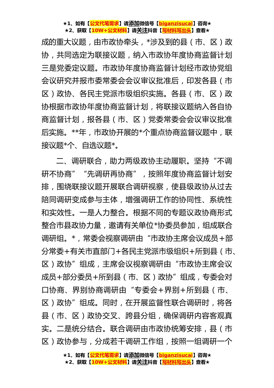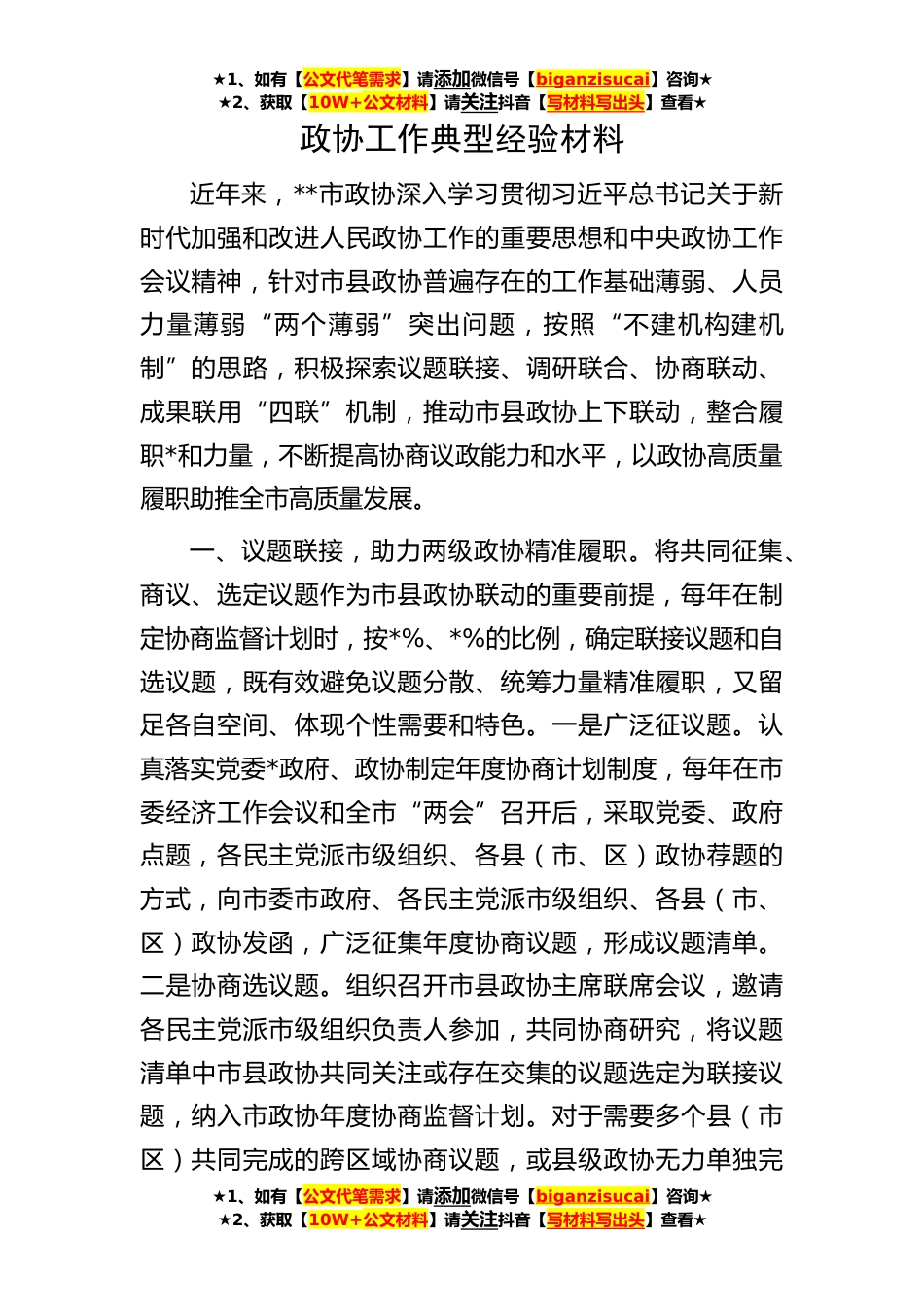 ★1、如有【公文代笔需求】请添加微信号【biganzisucai】咨询★★2、获取【10W+公文材料】请关注抖音【写材料写出头】查看★政协工作典型经验材料近年来,**市政协深入学习贯彻习近平总书记关于新时代加强和改进人民政协工作的重要思想和中央政协工作会议精神,针对市县政协普遍存在的工作基础薄弱、人员力量薄弱“两个薄弱”突出问题,按照“不建机构建机制”的思路,积极探索议题联接、调研联合、协商联动、成果联用“四联”机制,推动市县政协上下联动,整合履职*和力量,不断提高协商议政能力和水平,以政协高质量履职助推全市高质量发展。一、议题联接,助力两级政协精准履职。将共同征集、商议、选定议题作为市县政协联动的重要前提,每年在制定协商监督计划时,按*%、*%的比例,确定联接议题和自选议题,既...