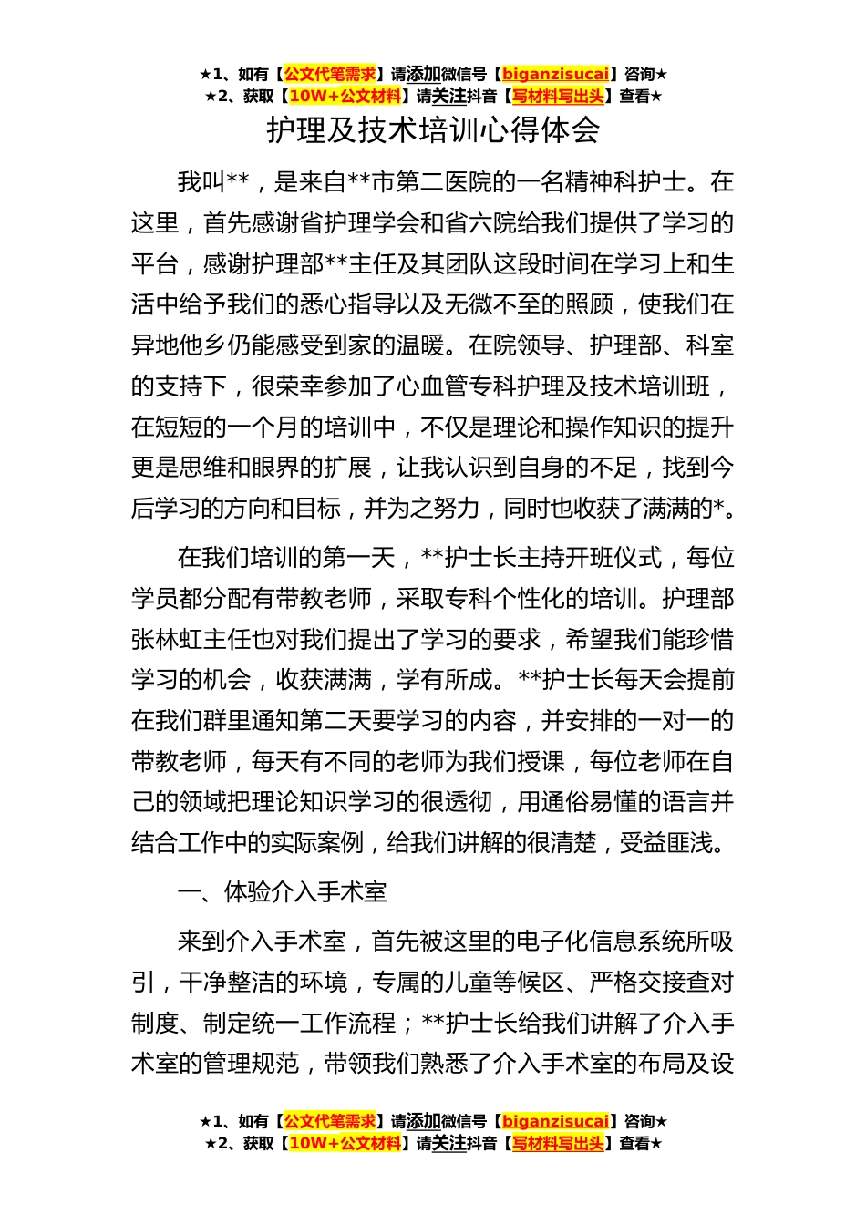 ★1、如有【公文代笔需求】请添加微信号【biganzisucai】咨询★★2、获取【10W+公文材料】请关注抖音【写材料写出头】查看★护理及技术培训心得体会我叫**,是来自**市第二医院的一名精神科护士。在这里,首先感谢省护理学会和省六院给我们提供了学习的平台,感谢护理部**主任及其团队这段时间在学习上和生活中给予我们的悉心指导以及无微不至的照顾,使我们在异地他乡仍能感受到家的温暖。在院领导、护理部、科室的支持下,很荣幸参加了心血管专科护理及技术培训班,在短短的一个月的培训中,不仅是理论和操作知识的提升更是思维和眼界的扩展,让我认识到自身的不足,找到今后学习的方向和目标,并为之努力,同时也收获了满满的*。在我们培训的第一天,**护士长主持开班仪式,每位学员都分配有带教老师,采取专科...