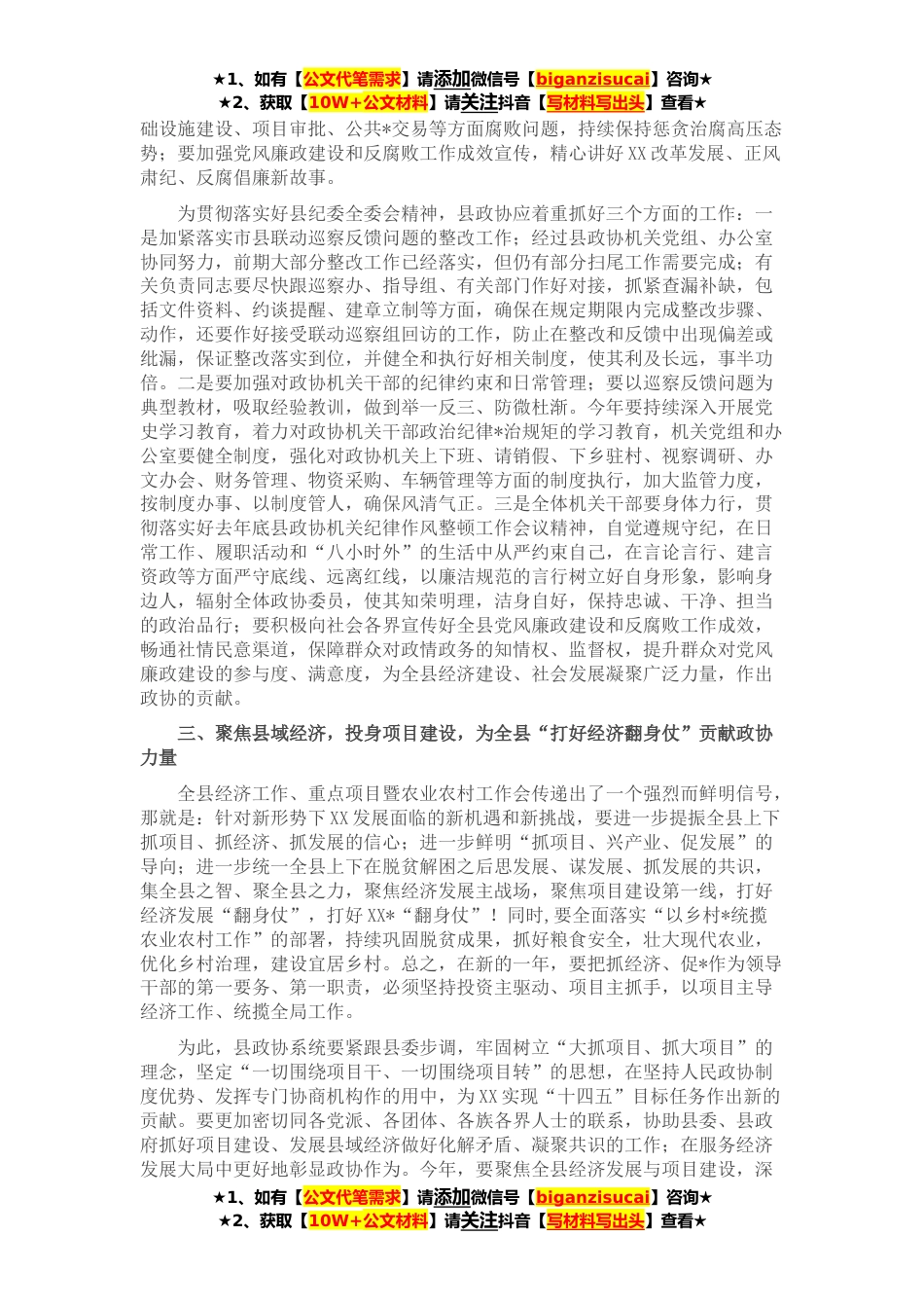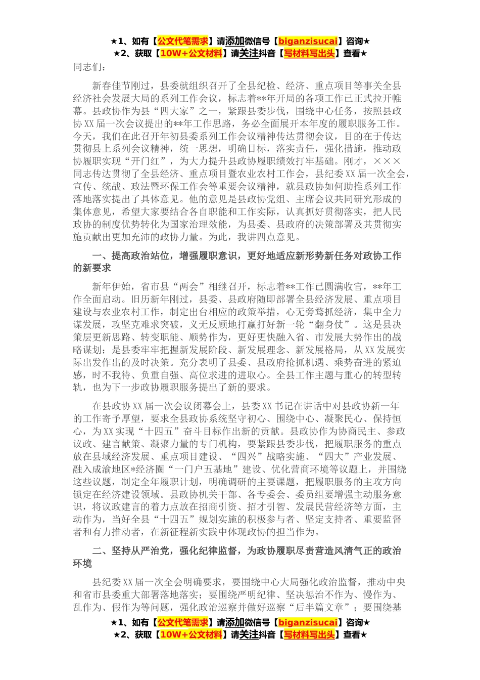★1、如有【公文代笔需求】请添加微信号【biganzisucai】咨询★★2、获取【10W+公文材料】请关注抖音【写材料写出头】查看★同志们:新春佳节刚过,县委就组织召开了全县纪检、经济、重点项目等事关全县经济社会发展大局的系列工作会议,标志着**年开局的各项工作已正式拉开帷幕。县政协作为县“四大家”之一,紧跟县委步伐,围绕中心任务,按照县政协XX届一次会议提出的**年工作思路,务必全面展开本年度的履职服务工作。今天,我们在此召开年初县委系列工作会议精神传达贯彻会议,目的在于传达贯彻县上系列会议精神,统一思想,明确目标,落实责任,强化措施,推动政协履职实现“开门红”,为大力提升县政协履职绩效打牢基础。刚才,×××同志传达贯彻了全县经济、重点项目暨农业农村工作会,县纪委XX届一次全...