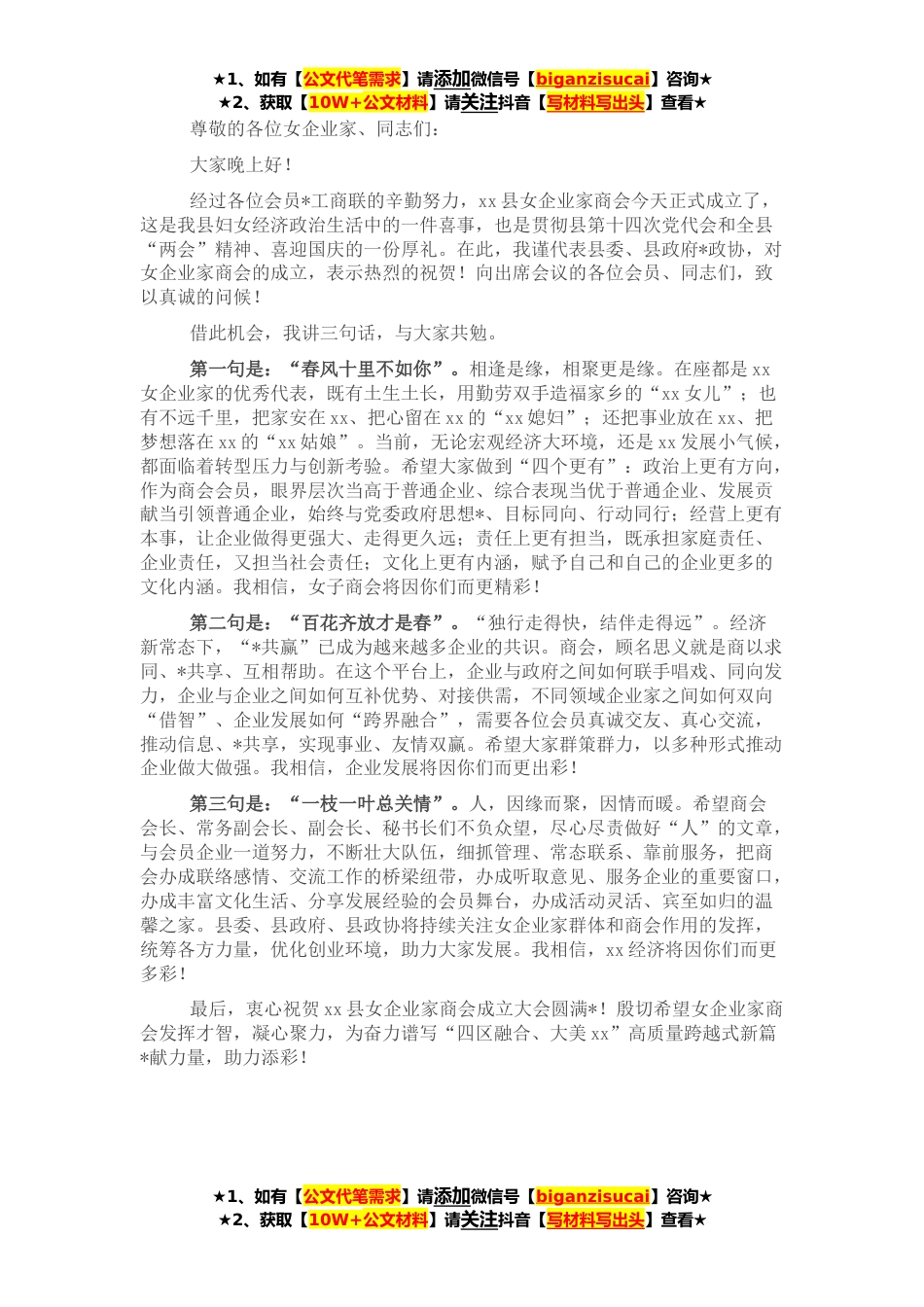 ★1、如有【公文代笔需求】请添加微信号【biganzisucai】咨询★★2、获取【10W+公文材料】请关注抖音【写材料写出头】查看★尊敬的各位女企业家、同志们:大家晚上好!经过各位会员*工商联的辛勤努力,xx县女企业家商会今天正式成立了,这是我县妇女经济政治生活中的一件喜事,也是贯彻县第十四次党代会和全县“两会”精神、喜迎国庆的一份厚礼。在此,我谨代表县委、县政府*政协,对女企业家商会的成立,表示热烈的祝贺!向出席会议的各位会员、同志们,致以真诚的问候!借此机会,我讲三句话,与大家共勉。第一句是:“春风十里不如你”。相逢是缘,相聚更是缘。在座都是xx女企业家的优秀代表,既有土生土长,用勤劳双手造福家乡的“xx女儿”;也有不远千里,把家安在xx、把心留在xx的“xx媳妇”;还把事业放在x...