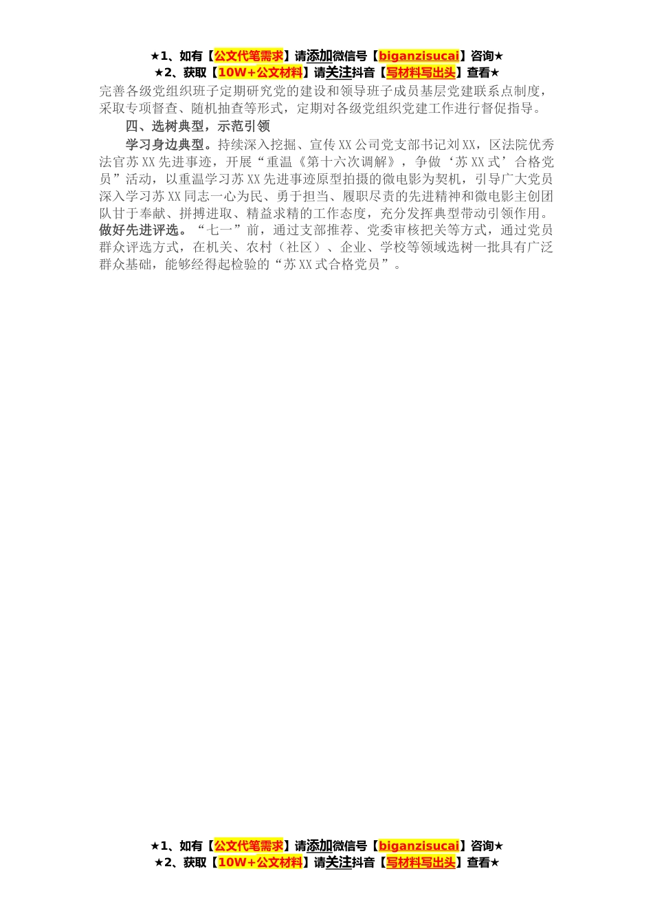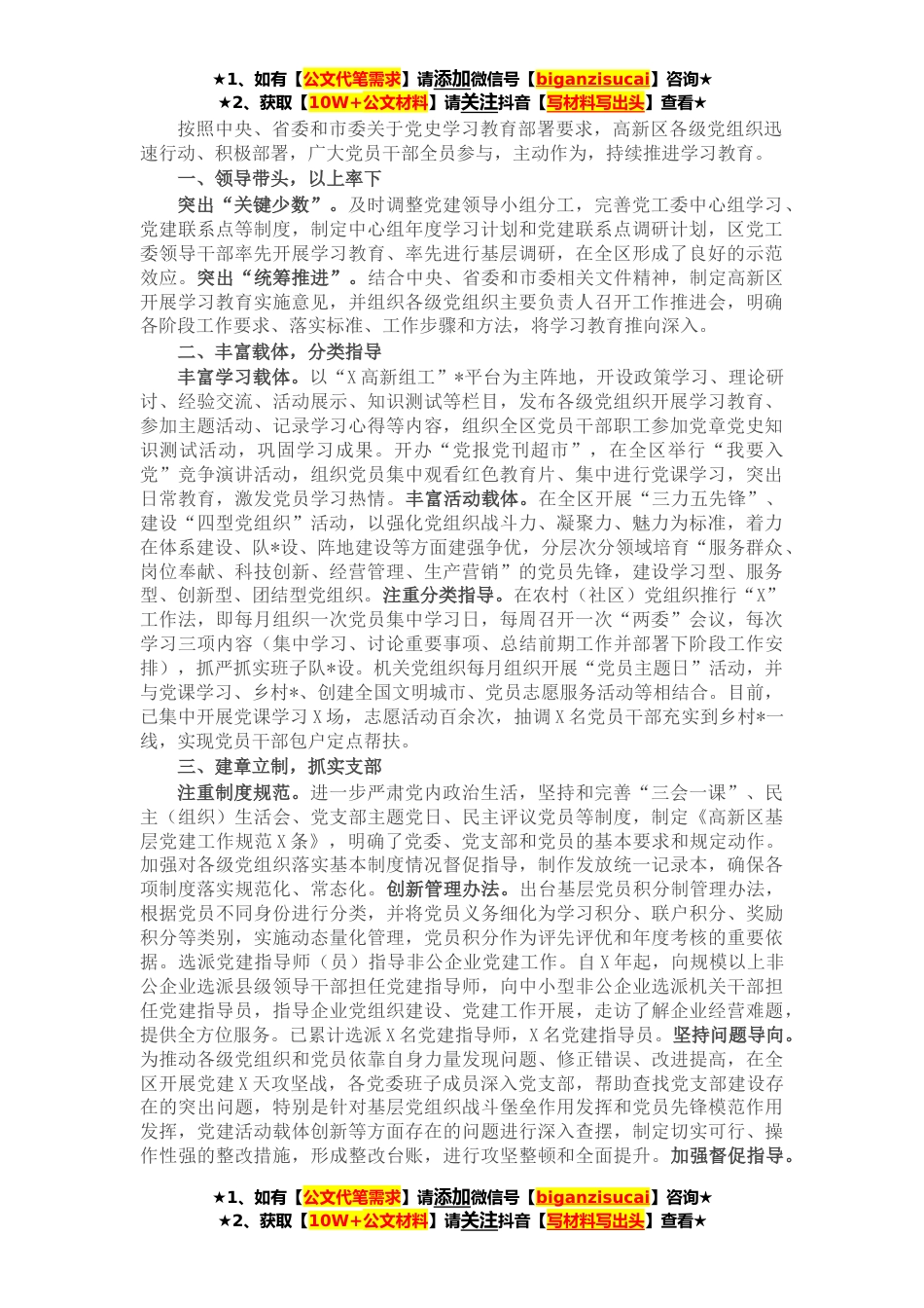 ★1、如有【公文代笔需求】请添加微信号【biganzisucai】咨询★★2、获取【10W+公文材料】请关注抖音【写材料写出头】查看★按照中央、省委和市委关于党史学习教育部署要求,高新区各级党组织迅速行动、积极部署,广大党员干部全员参与,主动作为,持续推进学习教育。一、领导带头,以上率下突出“关键少数”。及时调整党建领导小组分工,完善党工委中心组学习、党建联系点等制度,制定中心组年度学习计划和党建联系点调研计划,区党工委领导干部率先开展学习教育、率先进行基层调研,在全区形成了良好的示范效应。突出“统筹推进”。结合中央、省委和市委相关文件精神,制定高新区开展学习教育实施意见,并组织各级党组织主要负责人召开工作推进会,明确各阶段工作要求、落实标准、工作步骤和方法,将学习教育推...
