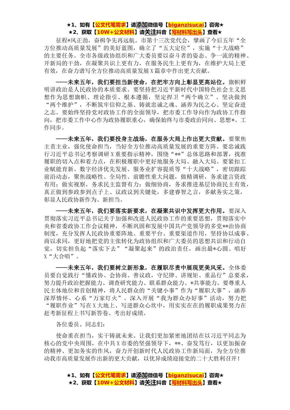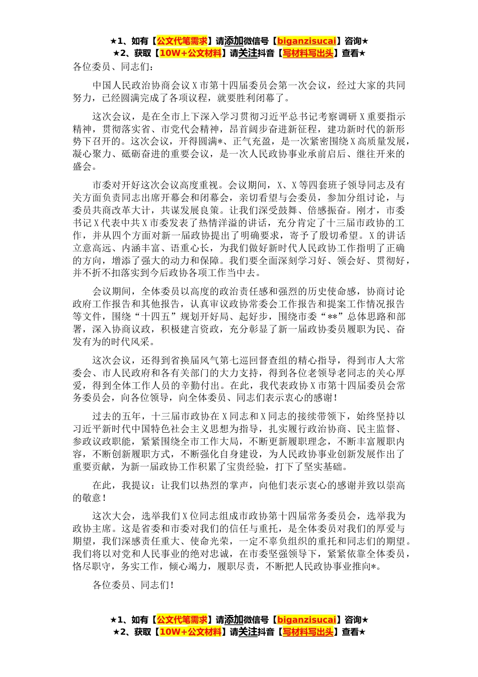 ★1、如有【公文代笔需求】请添加微信号【biganzisucai】咨询★★2、获取【10W+公文材料】请关注抖音【写材料写出头】查看★各位委员、同志们:中国人民政治协商会议X市第十四届委员会第一次会议,经过大家的共同努力,已经圆满完成了各项议程,就要胜利闭幕了。这次会议,是在全市上下深入学习贯彻习近平总书记考察调研X重要指示精神,贯彻落实省、市党代会精神,昂首阔步奋进新征程,建功新时代的新形势下召开的。这次会议,开得圆满*、正气充盈,是一次紧密围绕X高质量发展,凝心聚力、砥砺奋进的重要会议,是一次人民政协事业承前启后、继往开来的盛会。市委对开好这次会议高度重视。会议期间,X、X等四套班子领导同志及有关方面负责同志出席开幕会和闭幕会,亲切看望与会委员,参加分组讨论,与委员共商改革...