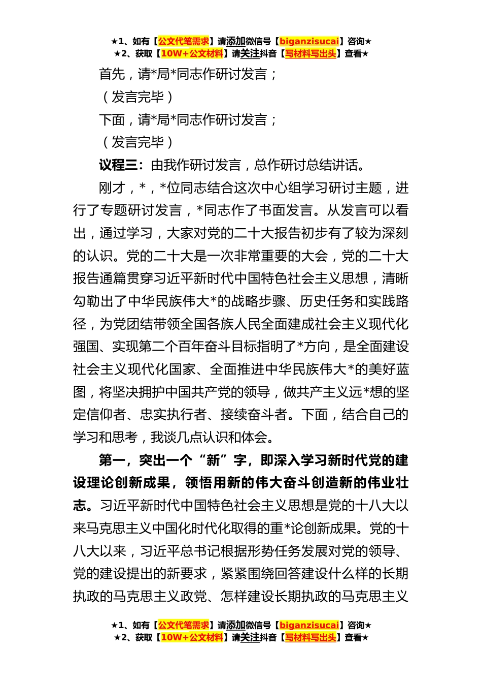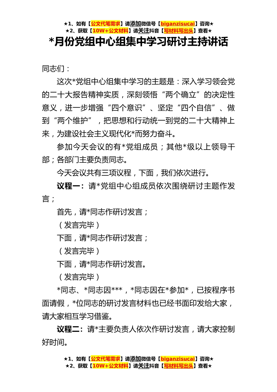 ★1、如有【公文代笔需求】请添加微信号【biganzisucai】咨询★★2、获取【10W+公文材料】请关注抖音【写材料写出头】查看★*月份党组中心组集中学习研讨主持讲话同志们:这次*党组中心组集中学习的主题是:深入学习领会党的二十大报告精神实质,深刻领悟“两个确立”的决定性意义,进一步增强“四个意识”、坚定“四个自信”、做到“两个维护”,把思想和行动统一到党的二十大精神上来,为建设社会主义现代化*而努力奋斗。参加今天会议的有*党组成员;其他*级以上领导干部;各部门主要负责同志。今天会议共有三项议程,下面,我们依次进行。议程一:请*党组中心组成员依次围绕研讨主题作发言;首先,请*同志作研讨发言;(发言完毕)下面,请*同志作研讨发言;(发言完毕)下面,请*同志作研讨发言。(发言完毕)...