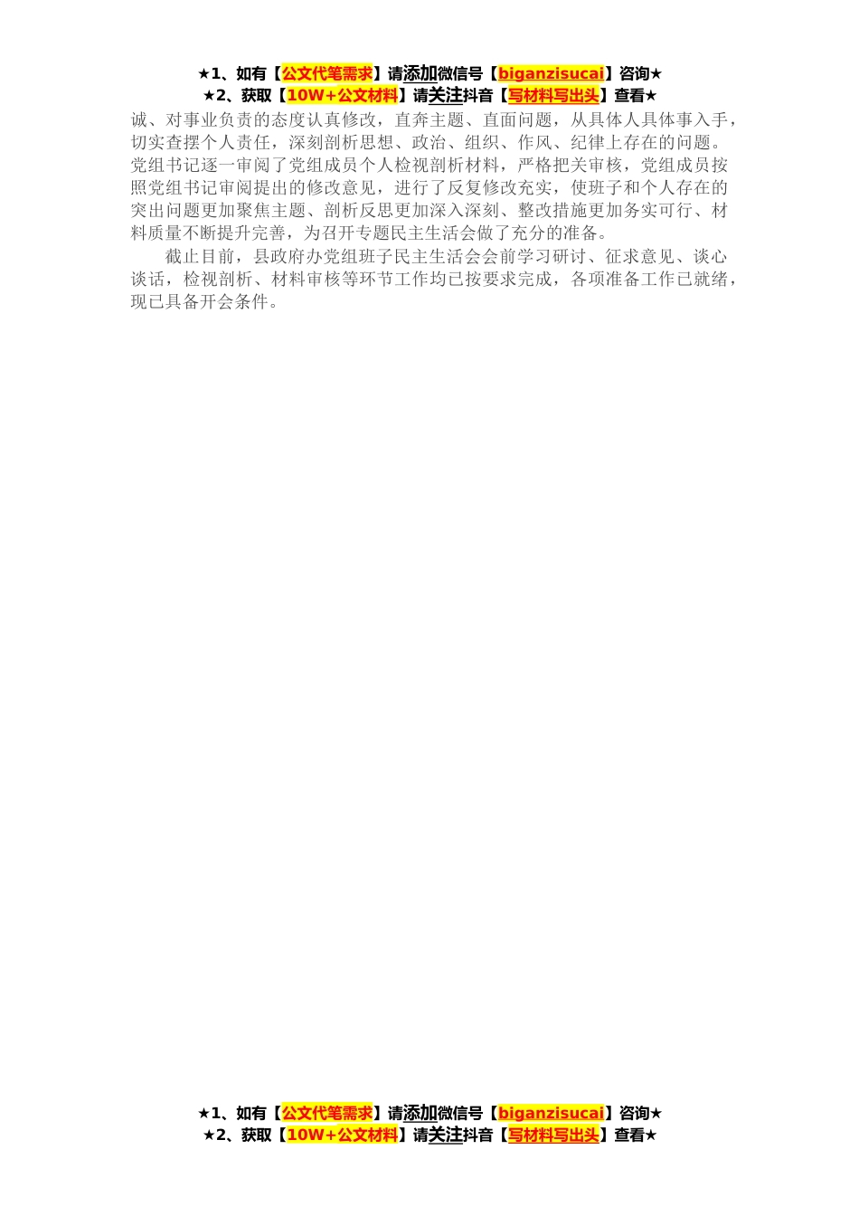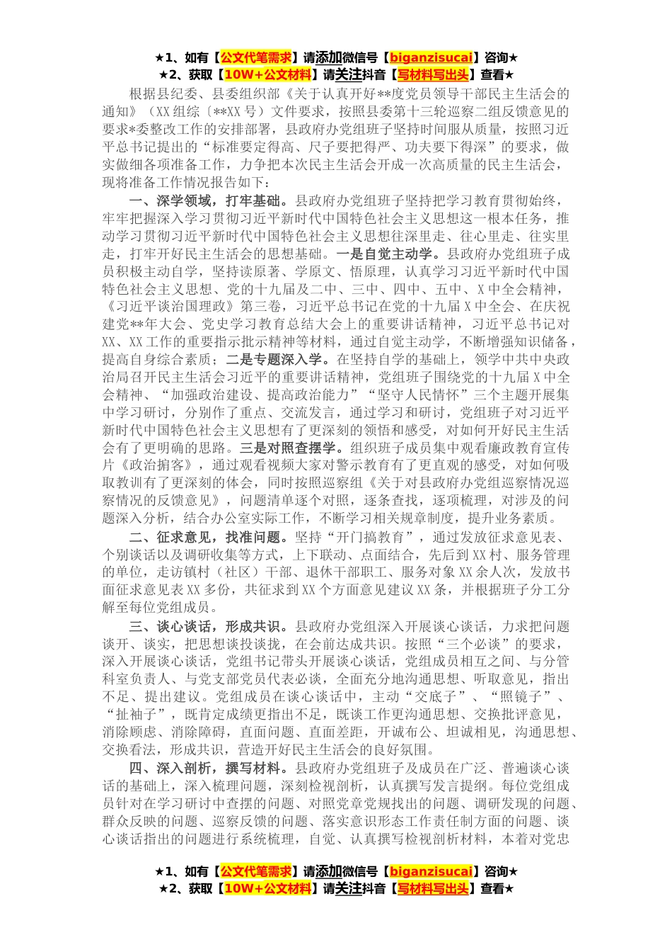 ★1、如有【公文代笔需求】请添加微信号【biganzisucai】咨询★★2、获取【10W+公文材料】请关注抖音【写材料写出头】查看★根据县纪委、县委组织部《关于认真开好**度党员领导干部民主生活会的通知》(XX组综〔**XX号)文件要求,按照县委第十三轮巡察二组反馈意见的要求*委整改工作的安排部署,县政府办党组班子坚持时间服从质量,按照习近平总书记提出的“标准要定得高、尺子要把得严、功夫要下得深”的要求,做实做细各项准备工作,力争把本次民主生活会开成一次高质量的民主生活会,现将准备工作情况报告如下:一、深学领域,打牢基础。县政府办党组班子坚持把学习教育贯彻始终,牢牢把握深入学习贯彻习近平新时代中国特色社会主义思想这一根本任务,推动学习贯彻习近平新时代中国特色社会主义思想往深里走、...