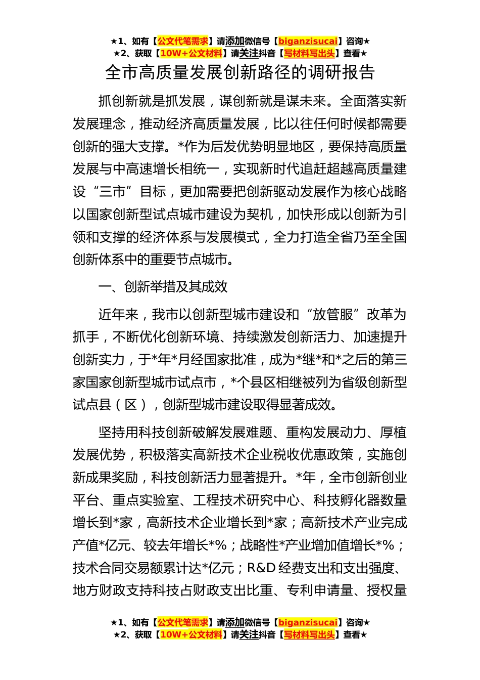 ★1、如有【公文代笔需求】请添加微信号【biganzisucai】咨询★★2、获取【10W+公文材料】请关注抖音【写材料写出头】查看★全市高质量发展创新路径的调研报告抓创新就是抓发展,谋创新就是谋未来。全面落实新发展理念,推动经济高质量发展,比以往任何时候都需要创新的强大支撑。*作为后发优势明显地区,要保持高质量发展与中高速增长相统一,实现新时代追赶超越高质量建设“三市”目标,更加需要把创新驱动发展作为核心战略以国家创新型试点城市建设为契机,加快形成以创新为引领和支撑的经济体系与发展模式,全力打造全省乃至全国创新体系中的重要节点城市。一、创新举措及其成效近年来,我市以创新型城市建设和“放管服”改革为抓手,不断优化创新环境、持续激发创新活力、加速提升创新实力,于*年*月经国家批...