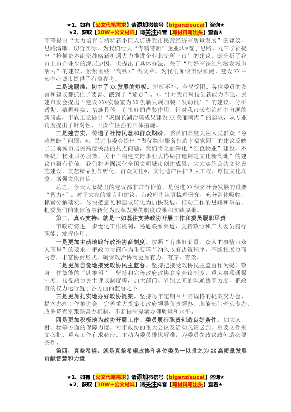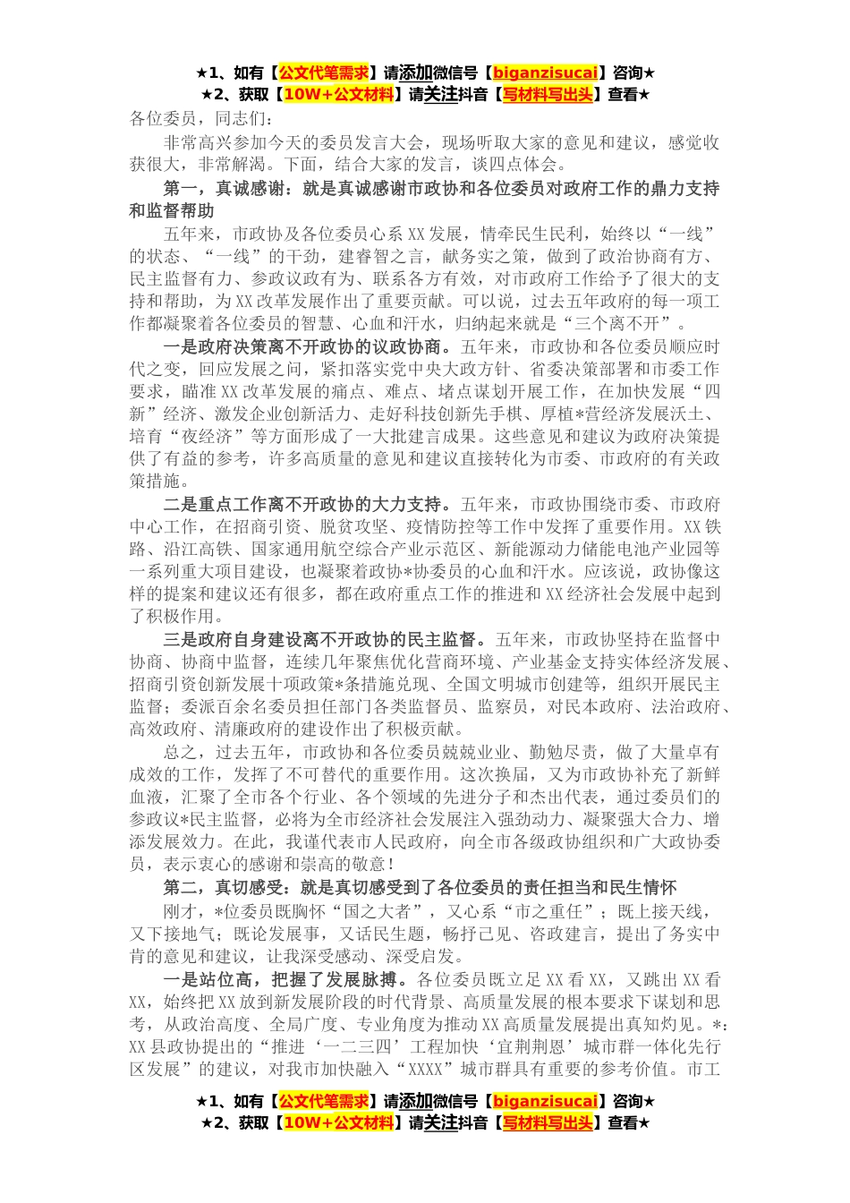 ★1、如有【公文代笔需求】请添加微信号【biganzisucai】咨询★★2、获取【10W+公文材料】请关注抖音【写材料写出头】查看★各位委员,同志们:非常高兴参加今天的委员发言大会,现场听取大家的意见和建议,感觉收获很大,非常解渴。下面,结合大家的发言,谈四点体会。第一,真诚感谢:就是真诚感谢市政协和各位委员对政府工作的鼎力支持和监督帮助五年来,市政协及各位委员心系XX发展,情牵民生民利,始终以“一线”的状态、“一线”的干劲,建睿智之言,献务实之策,做到了政治协商有方、民主监督有力、参政议政有为、联系各方有效,对市政府工作给予了很大的支持和帮助,为XX改革发展作出了重要贡献。可以说,过去五年政府的每一项工作都凝聚着各位委员的智慧、心血和汗水,归纳起来就是“三个离不开”。一是...
