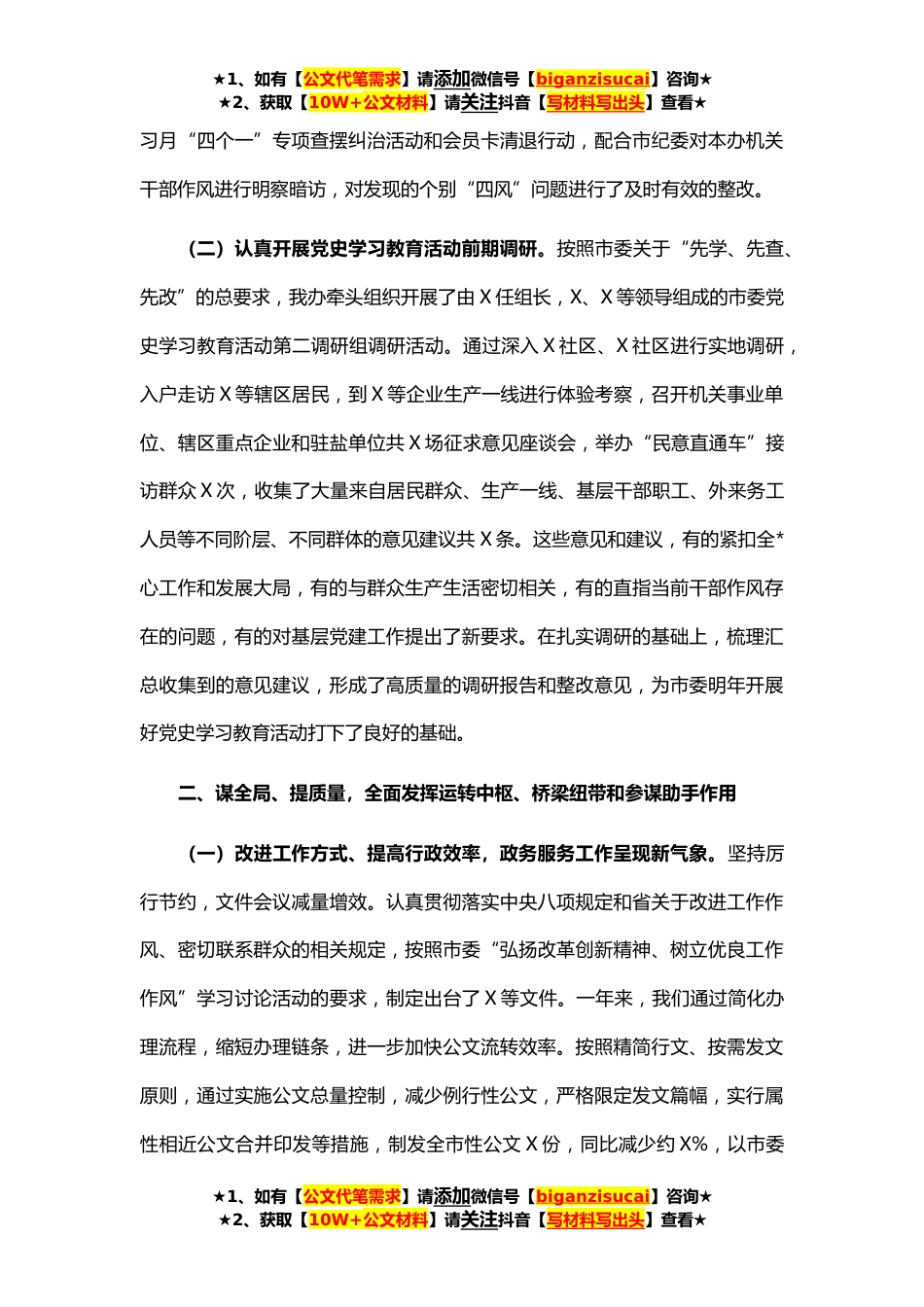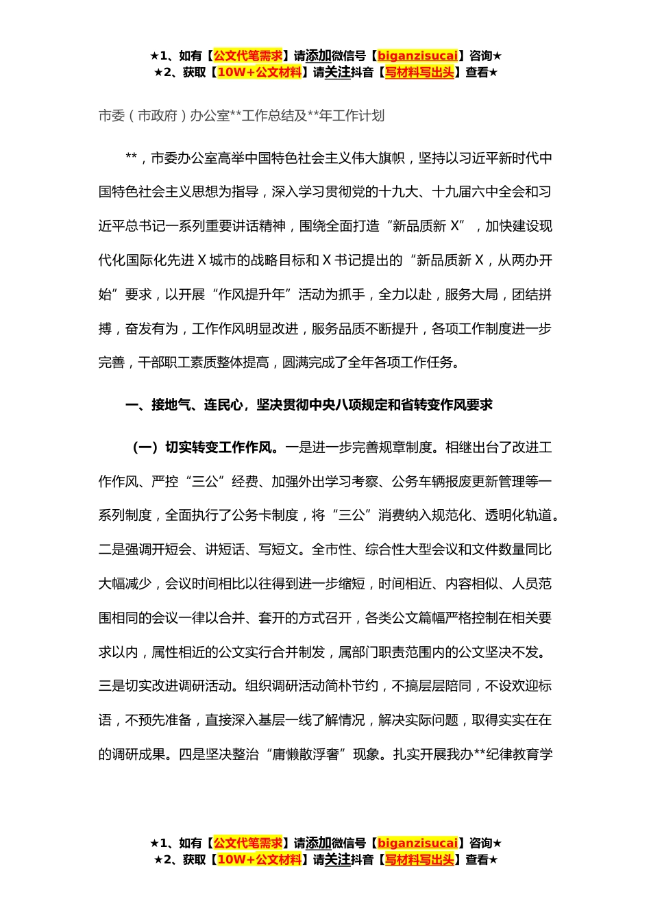 ★1、如有【公文代笔需求】请添加微信号【biganzisucai】咨询★★2、获取【10W+公文材料】请关注抖音【写材料写出头】查看★市委(市政府)办公室**工作总结及**年工作计划**,市委办公室高举中国特色社会主义伟大旗帜,坚持以习近平新时代中国特色社会主义思想为指导,深入学习贯彻党的十九大、十九届六中全会和习近平总书记一系列重要讲话精神,围绕全面打造“新品质新X”,加快建设现代化国际化先进X城市的战略目标和X书记提出的“新品质新X,从两办开始”要求,以开展“作风提升年”活动为抓手,全力以赴,服务大局,团结拼搏,奋发有为,工作作风明显改进,服务品质不断提升,各项工作制度进一步完善,干部职工素质整体提高,圆满完成了全年各项工作任务。一、接地气、连民心,坚决贯彻中央八项规定和省转变...