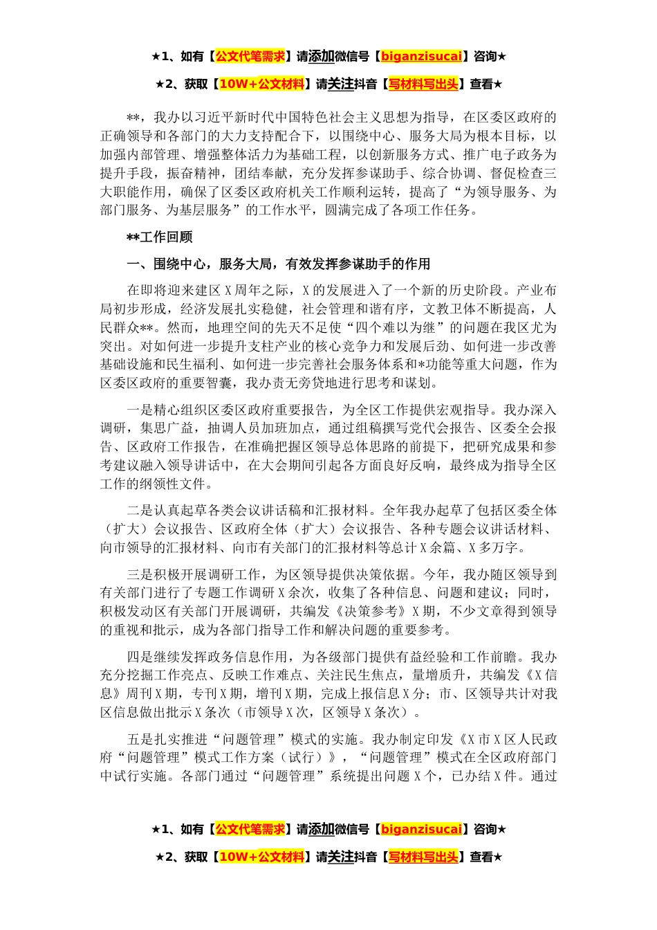 ★1、如有【公文代笔需求】请添加微信号【biganzisucai】咨询★★2、获取【10W+公文材料】请关注抖音【写材料写出头】查看★**,我办以习近平新时代中国特色社会主义思想为指导,在区委区政府的正确领导和各部门的大力支持配合下,以围绕中心、服务大局为根本目标,以加强内部管理、增强整体活力为基础工程,以创新服务方式、推广电子政务为提升手段,振奋精神,团结奉献,充分发挥参谋助手、综合协调、督促检查三大职能作用,确保了区委区政府机关工作顺利运转,提高了“为领导服务、为部门服务、为基层服务”的工作水平,圆满完成了各项工作任务。**工作回顾一、围绕中心,服务大局,有效发挥参谋助手的作用在即将迎来建区X周年之际,X的发展进入了一个新的历史阶段。产业布局初步形成,经济发展扎实稳健,社会...