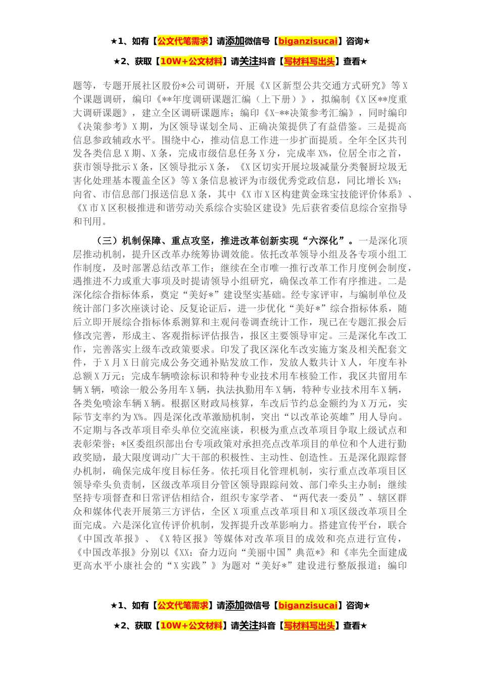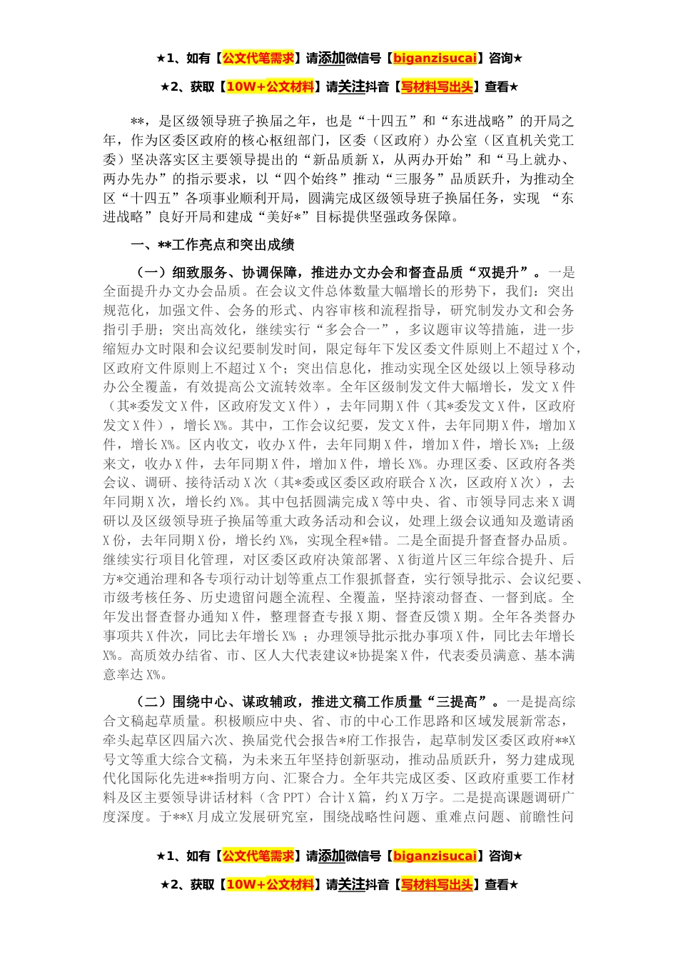 ★1、如有【公文代笔需求】请添加微信号【biganzisucai】咨询★★2、获取【10W+公文材料】请关注抖音【写材料写出头】查看★**,是区级领导班子换届之年,也是“十四五”和“东进战略”的开局之年,作为区委区政府的核心枢纽部门,区委(区政府)办公室(区直机关党工委)坚决落实区主要领导提出的“新品质新X,从两办开始”和“马上就办、两办先办”的指示要求,以“四个始终”推动“三服务”品质跃升,为推动全区“十四五”各项事业顺利开局,圆满完成区级领导班子换届任务,实现“东进战略”良好开局和建成“美好*”目标提供坚强政务保障。一、**工作亮点和突出成绩(一)细致服务、协调保障,推进办文办会和督查品质“双提升”。一是全面提升办文办会品质。在会议文件总体数量大幅增长的形势下,我们:突出规...
