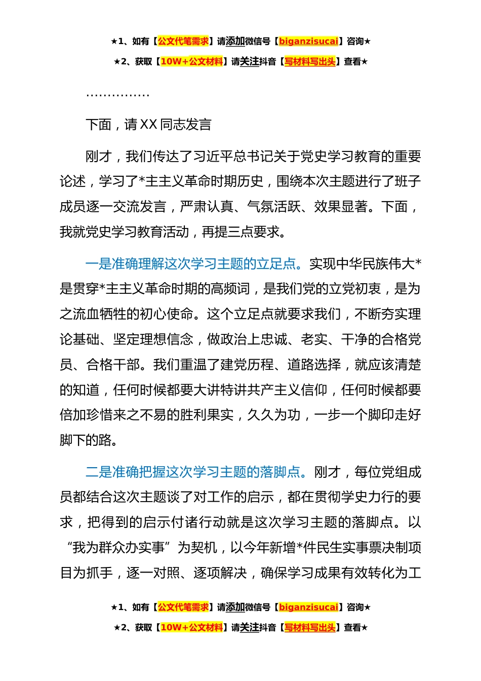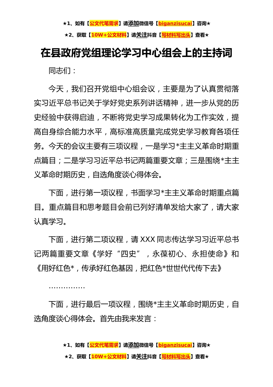 ★1、如有【公文代笔需求】请添加微信号【biganzisucai】咨询★★2、获取【10W+公文材料】请关注抖音【写材料写出头】查看★在县政府党组理论学习中心组会上的主持词同志们:今天,我们召开党组中心组会议,主要是为了认真贯彻落实习近平总书记关于学好党史系列讲话精神,进一步从党的历史经验中获得启迪,不断将党史学习成果转化为工作实效,提高自身综合能力水平,高标准高质量完成党史学习教育各项任务。今天的会议主要有三项议程,一是学习*主主义革命时期重点篇目;二是学习习近平总书记两篇重要文章;三是围绕*主主义革命时期历史,自选角度谈心得体会。下面,进行第一项议程,书面学习*主主义革命时期重点篇目。重点篇目和思考题目会前已列好清单发给大家了,请大家认真学习。下面,进行第二项议程,请XXX...