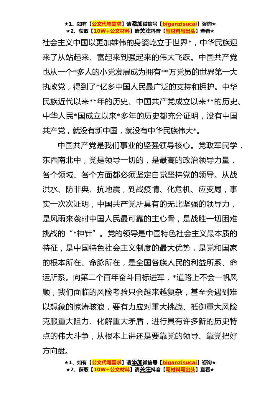 ★1、如有【公文代笔需求】请添加微信号【biganzisucai】咨询★★2、获取【10W+公文材料】请关注抖音【写材料写出头】查看★毫不动摇坚持党的坚强领导——三论学习贯彻习近平总书记在庆祝中国共产党成立**年大会上的重要讲话精神办好中国的事情,关键在党。在庆祝中国共产党成立**年大会上,习近平总书记全面总结了以史为鉴、开创未来的“九个必须”,为全面建成社会主义现代化强国、实现中华民族伟大*的中国梦提供了科学行动指南。其中,第一个必须就是“必须坚持中国共产党坚强领导”,这是对党的百年奋斗经验的精辟概括和科学总结,是谋划和推进党和国家事业发展的根本政治前提。我们一定要充分认识坚持党的坚强领导的极端重要性,充分发挥党总揽全局、协调各方的领导核心作用,确保党和国家的各项事业始终沿着...